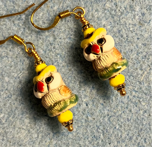 Small tan, yellow, and green ceramic owl bead earrings adorned with yellow Chinese crystal beads.