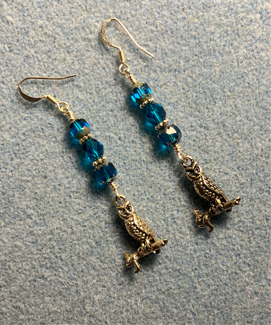 Silver owl charm earrings adorned with dark blue Czech glass beads