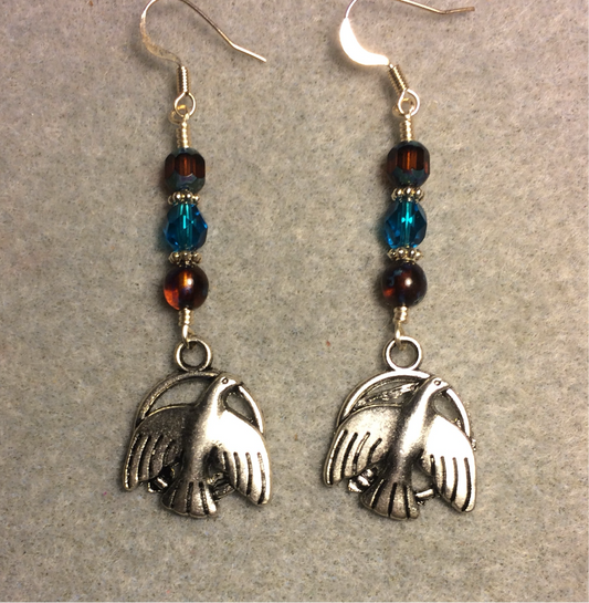 Silver hawk charm earrings adorned with brown and turquoise Czech glass beads