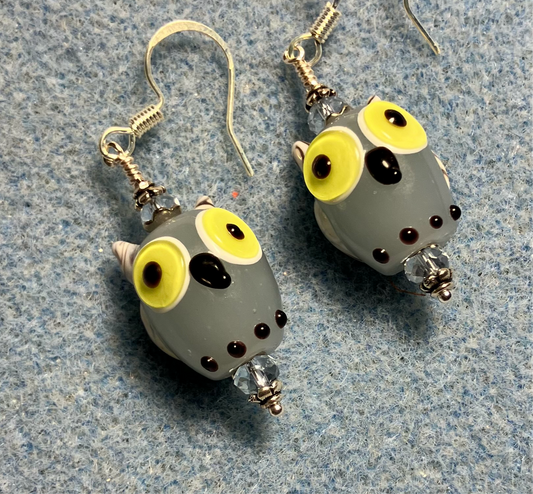 Gray lamp work owl bead earrings adorned with clear Czech glass beads.