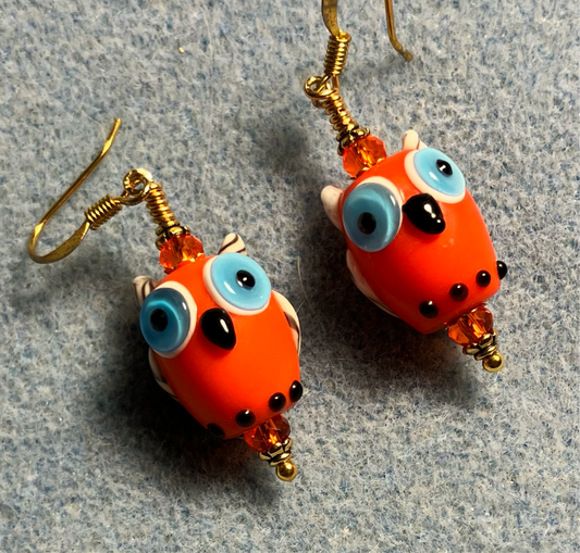 Orange lamp work owl bead earrings adorned with orange Chinese crystal beads.