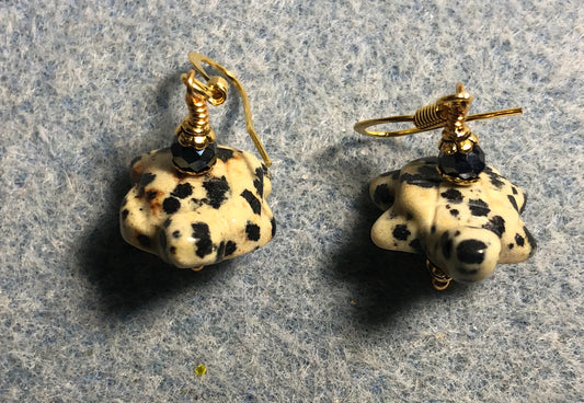 Dalmatian jasper gemstone turtle bead earrings adorned with black Chinese crystal beads.