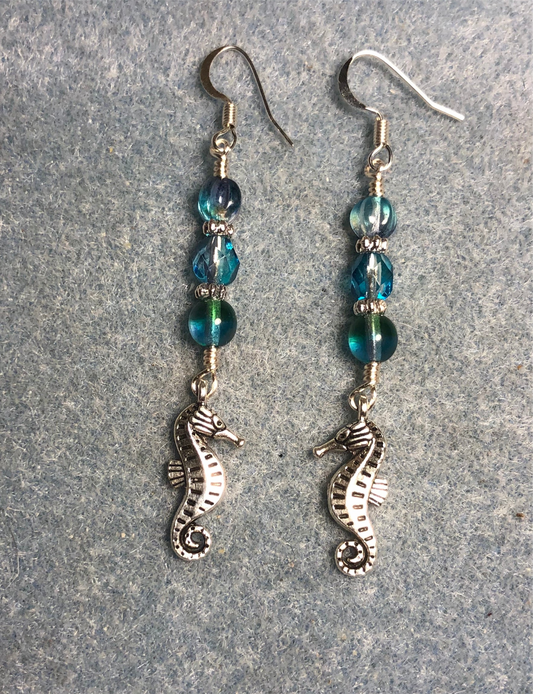 Silver seahorse charm earrings adorned with turquoise purple Czech glass beads