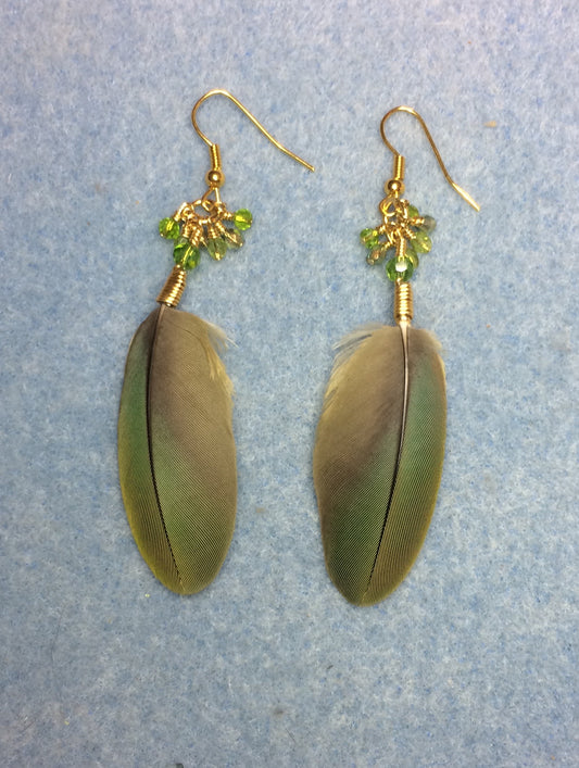Olive green red fronted macaw feather earrings adorned with tiny dangling olive green Chinese crystal beads