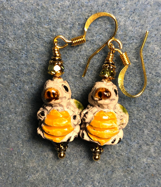 Small orange and black ceramic spotted lizard bead earrings adorned with amber Chinese crystal beads.