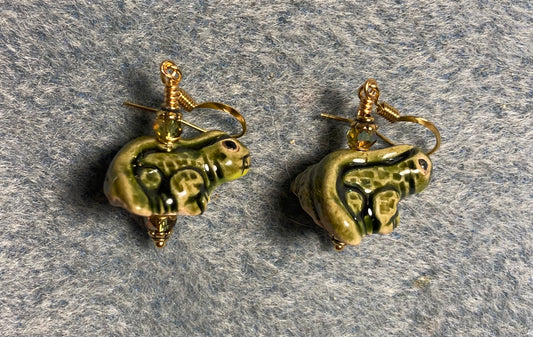 Small olive green ceramic alligator bead earrings adorned with olive green Chinese crystal beads.