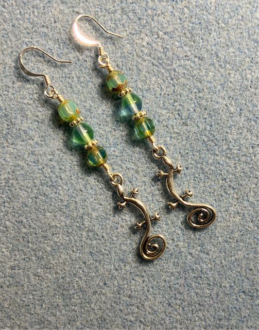 Small silver lizard charm earrings adorned with light green Czech glass beads