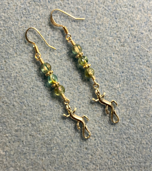 Small gold lizard charm earrings adorned with olive green Czech glass beads