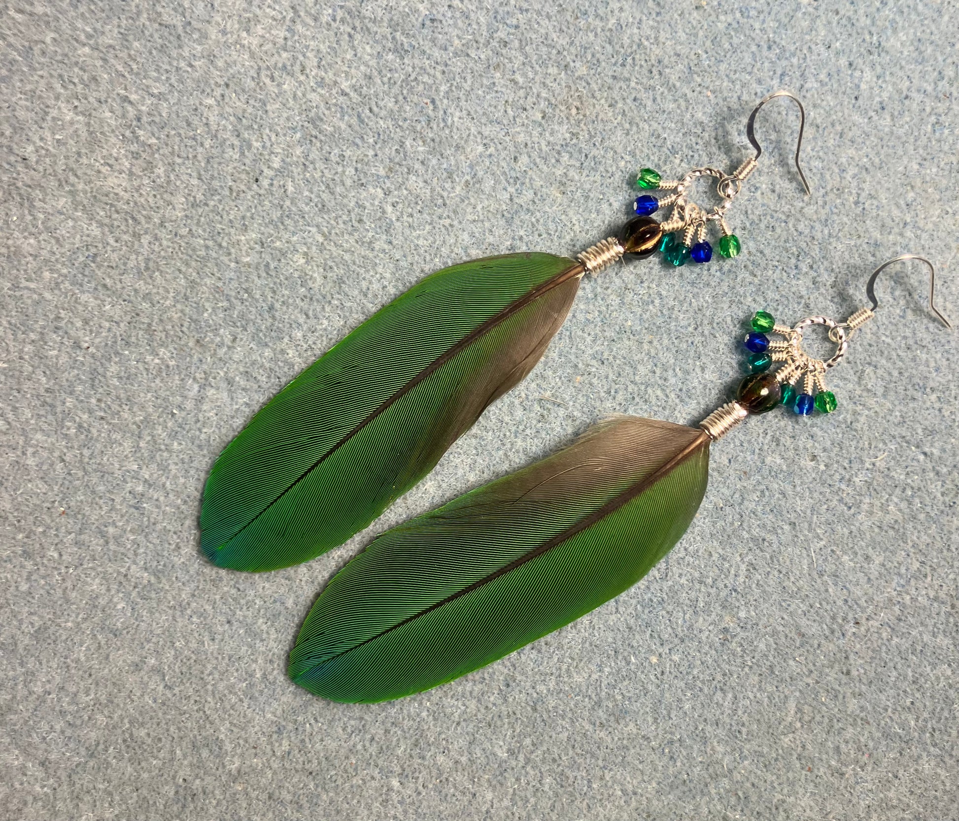 These gorgeous dark blue and green feathers were donated by my blue headed Pionus parrot Kirby. The earrings are made with silver wire and are adorned with blue and green Czech glass melon beads and small dangling blue, green, and turquoise Czech glass beads. The earrings are about 3.75 inches long.