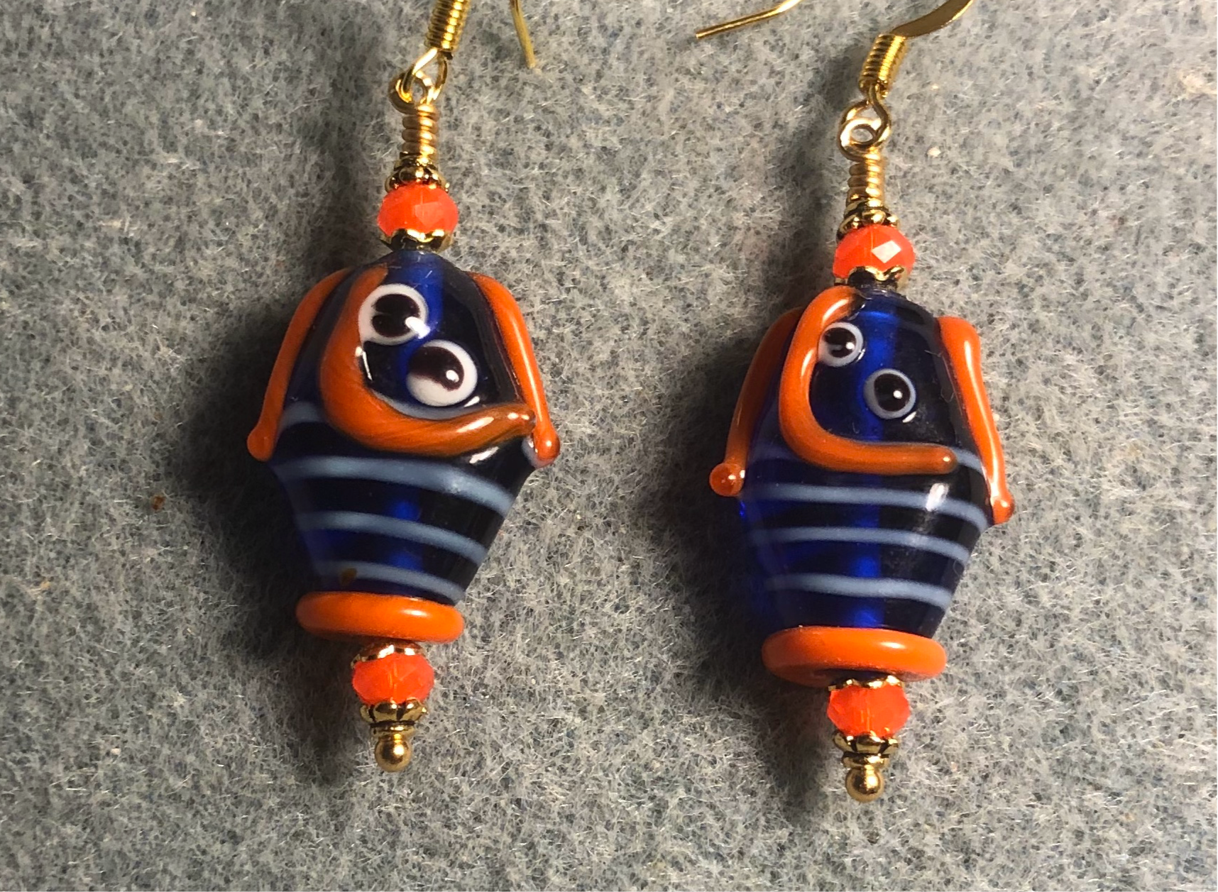 These adorable earrings are made with dark blue and orange lamp work fish beads and are adorned with orange Chinese crystal beads.
