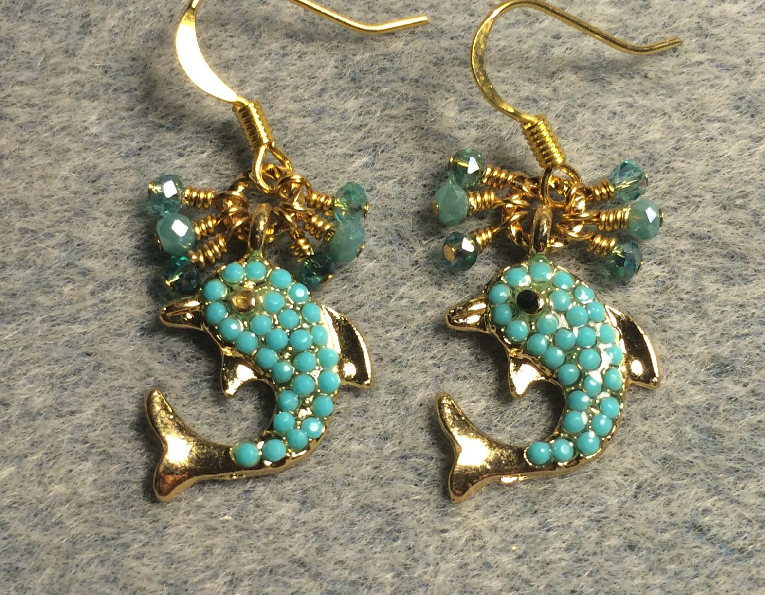Gold and aqua enamel dolphin charm earrings adorned with tiny dangling aqua Chinese crystal beads.