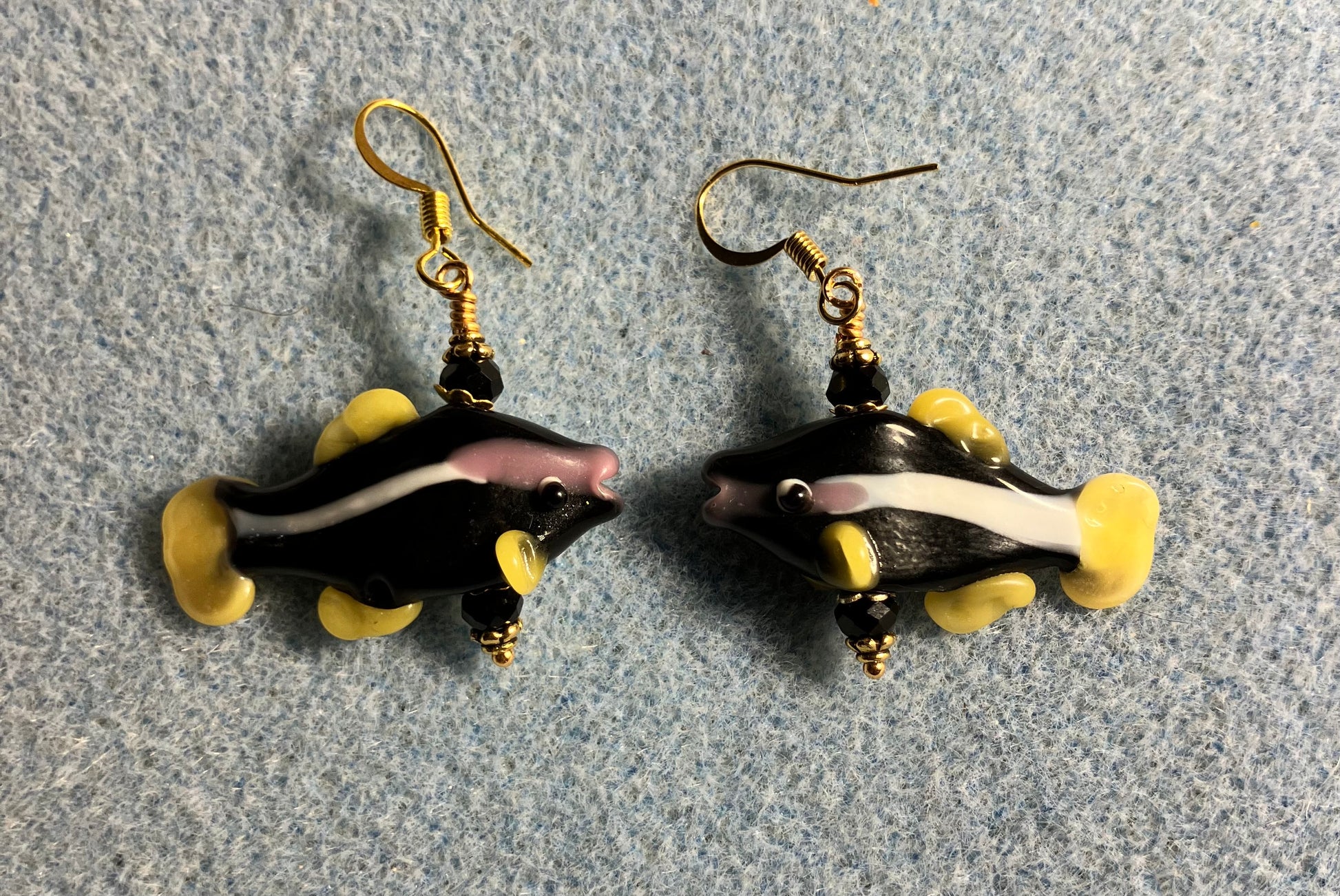 Black and yellow lamp work striped fish bead earrings adorned with black Chinese crystal beads.
