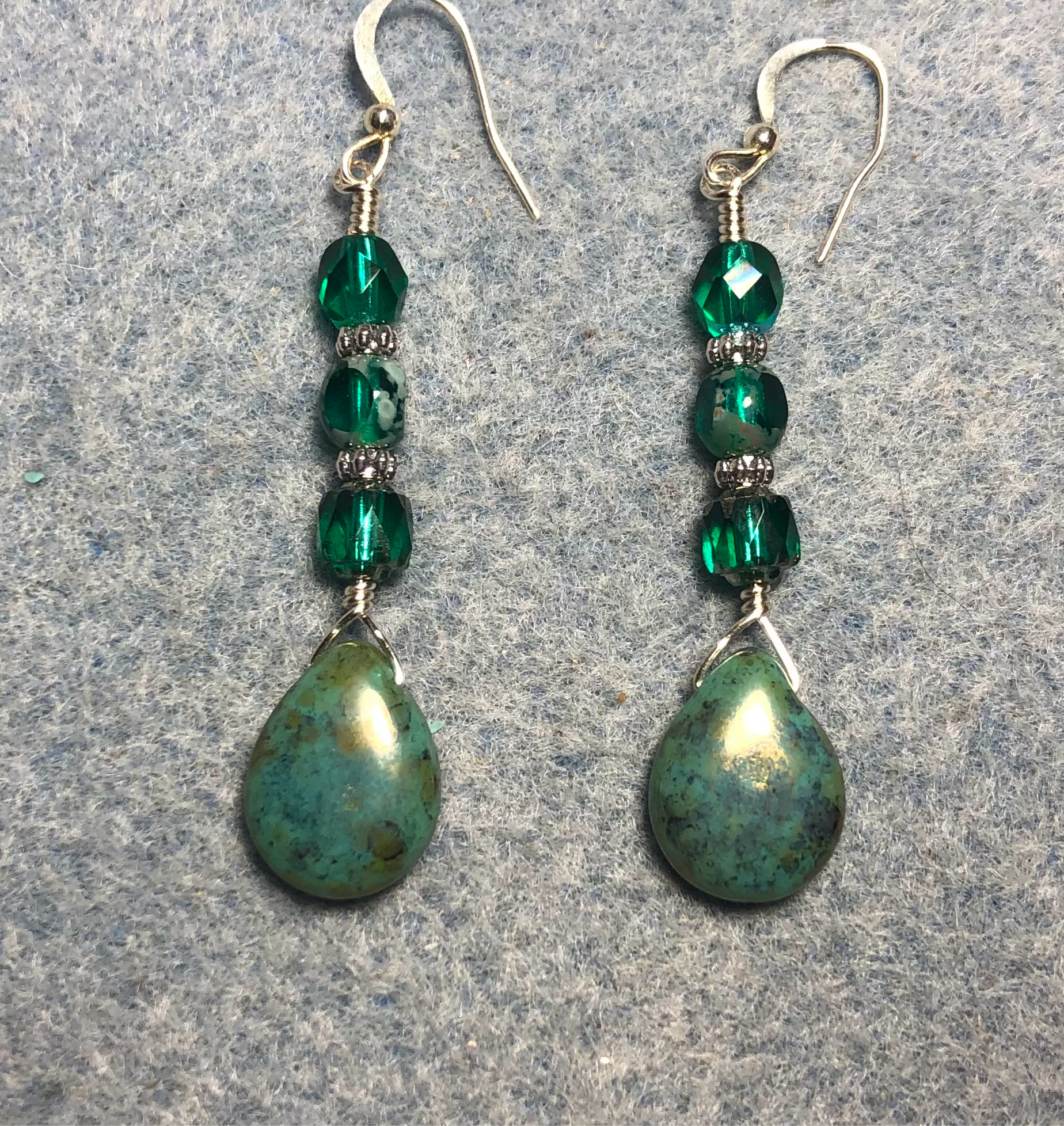 Teal Picasso Czech glass pear drop bead earrings adorned with teal Czech glass beads.