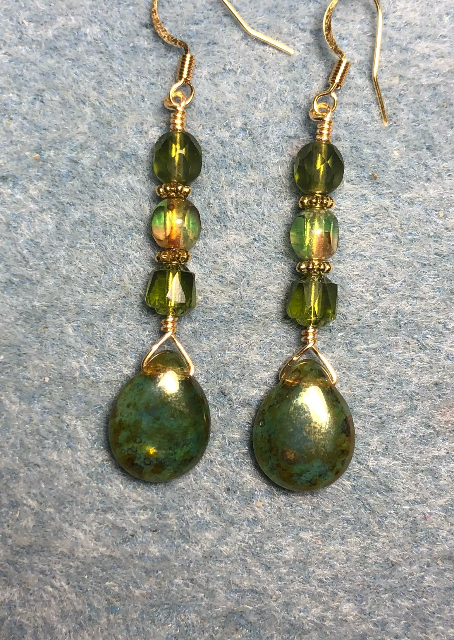 These beautiful earrings are made with olive green Czech glass pear drop beads and are adorned with olive green Czech glass beads.