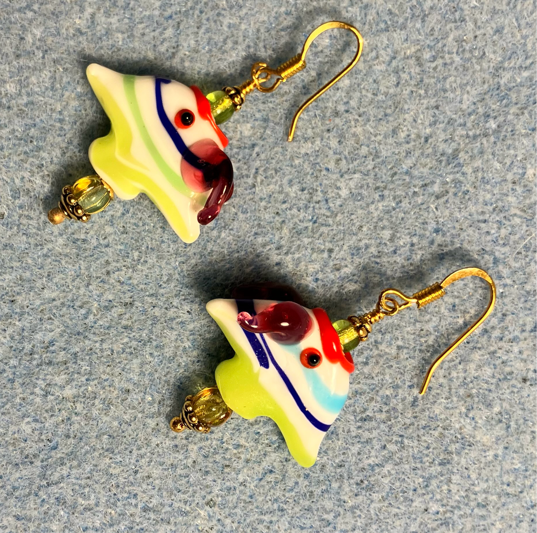 These adorable earrings are made with olive green, dark blue, purple, and red lamp work striped angelfish beads and are adorned with olive green Czech glass beads.