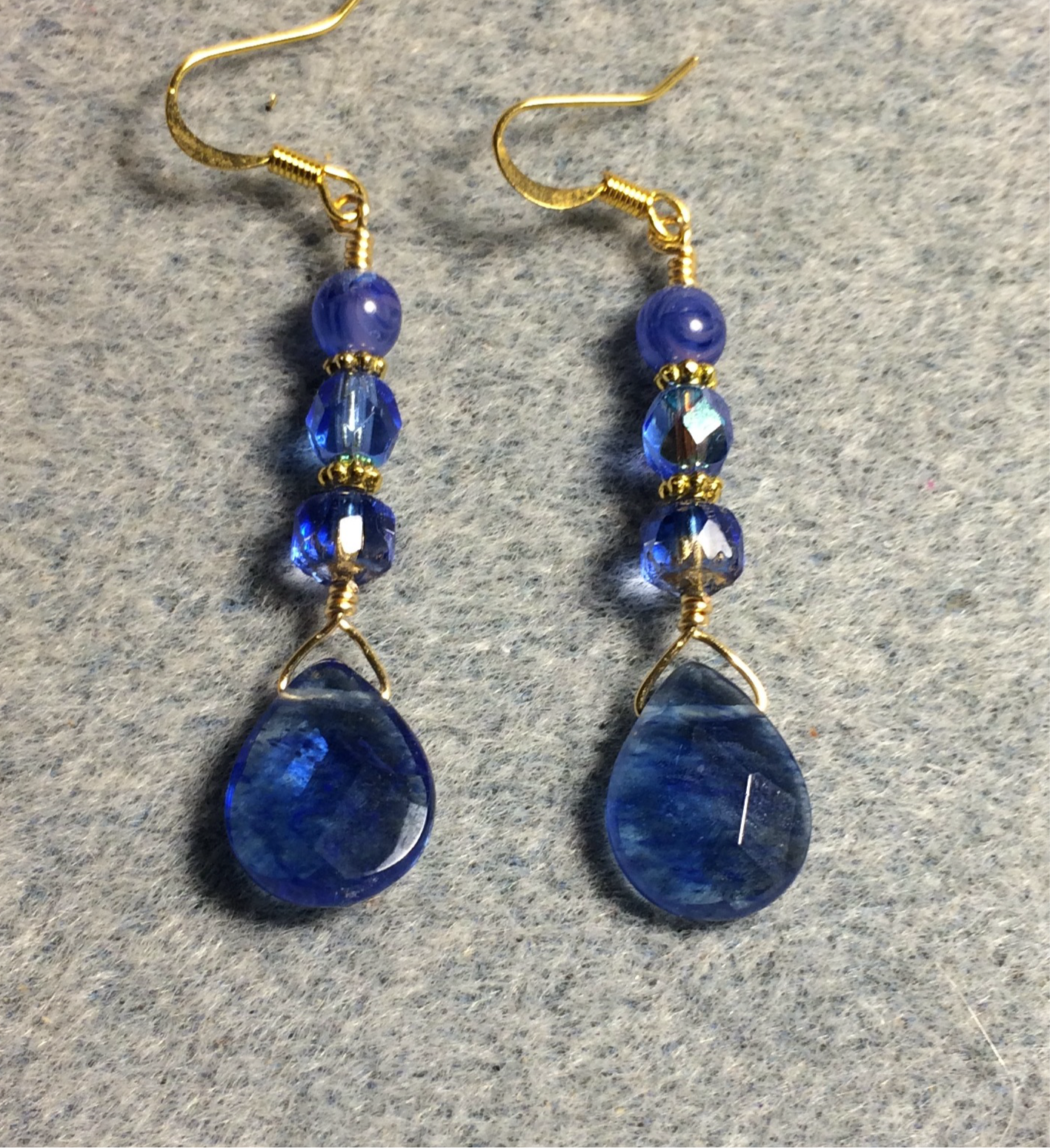 Blue mottled Czech glass briolette bead earrings adorned with blue Czech glass beads.