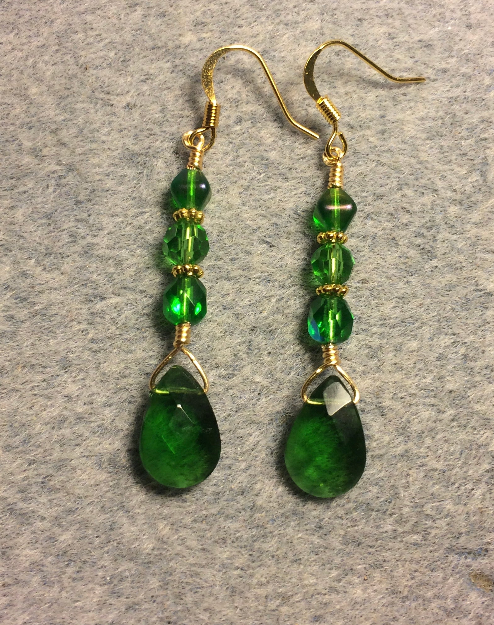 Emerald green Czech glass briolette bead earrings adorned with emerald green Czech glass beads.