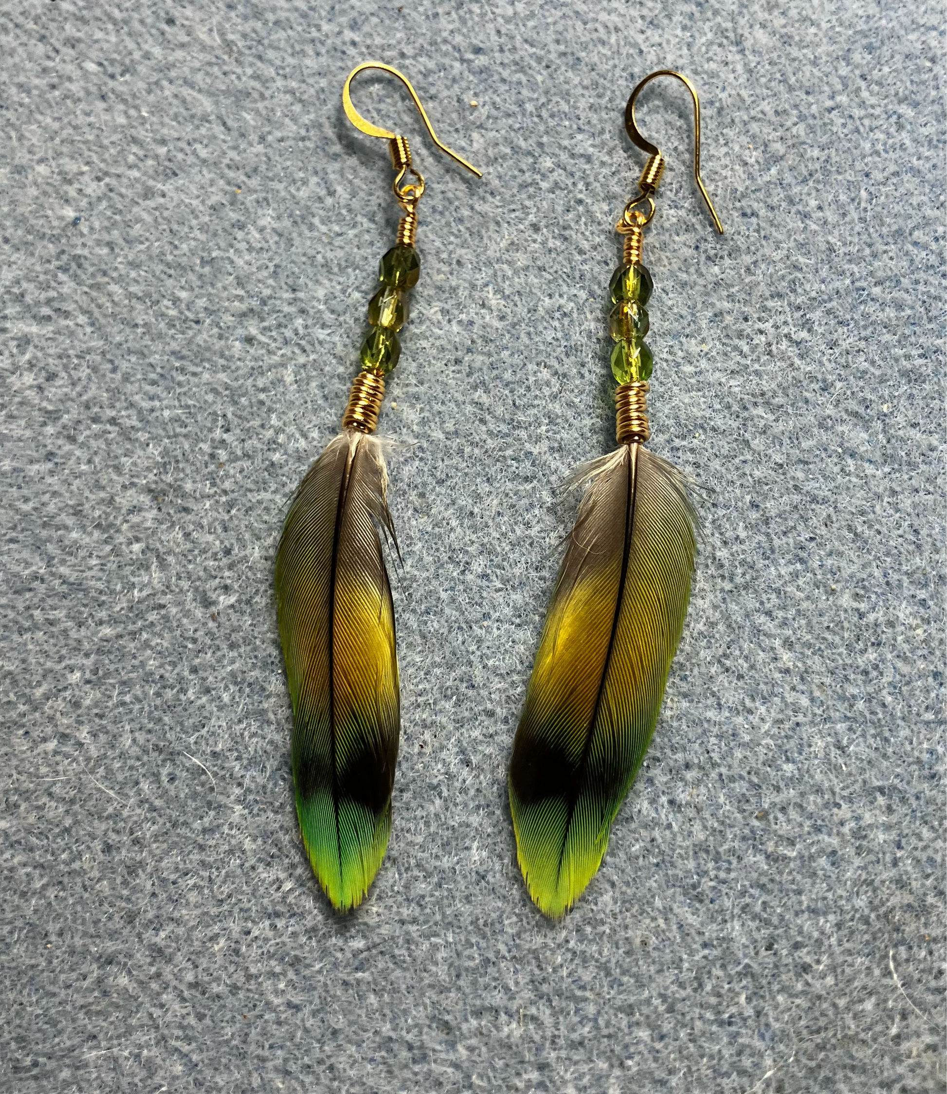 These pretty dark green and olive green feathers were donated by a friend’s lovebird. The earrings are made with gold wire and are adorned with small olive green Czech glass beads. The earrings are about 2.25 inches long.