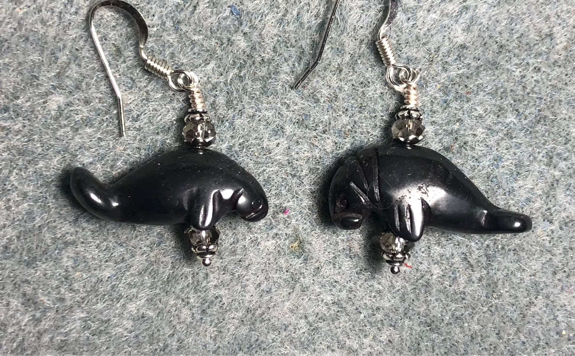Gray hematite gemstone manatee bead earrings adorned with gray Chinese crystal beads.