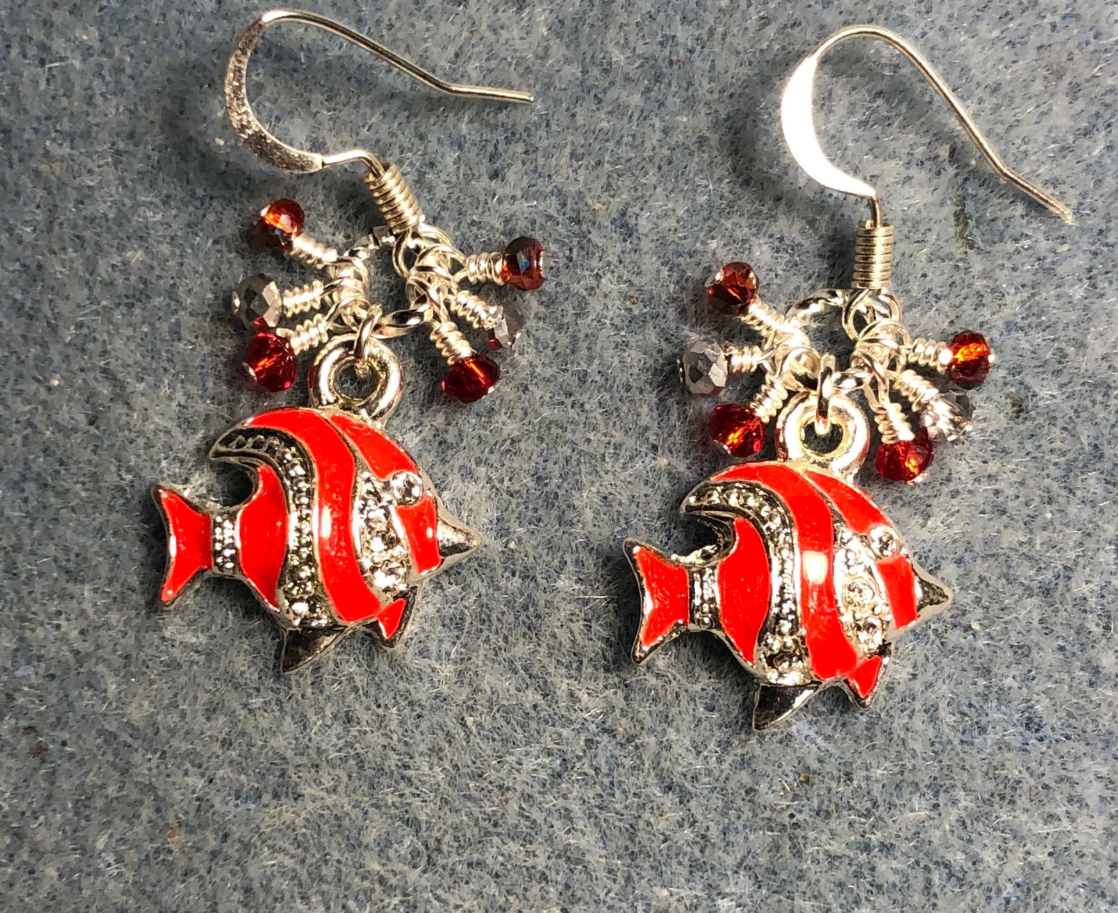 Silver and red enamel and rhinestone angelfish charm earrings adorned with tiny dangling red and silver Chinese crystal beads.
