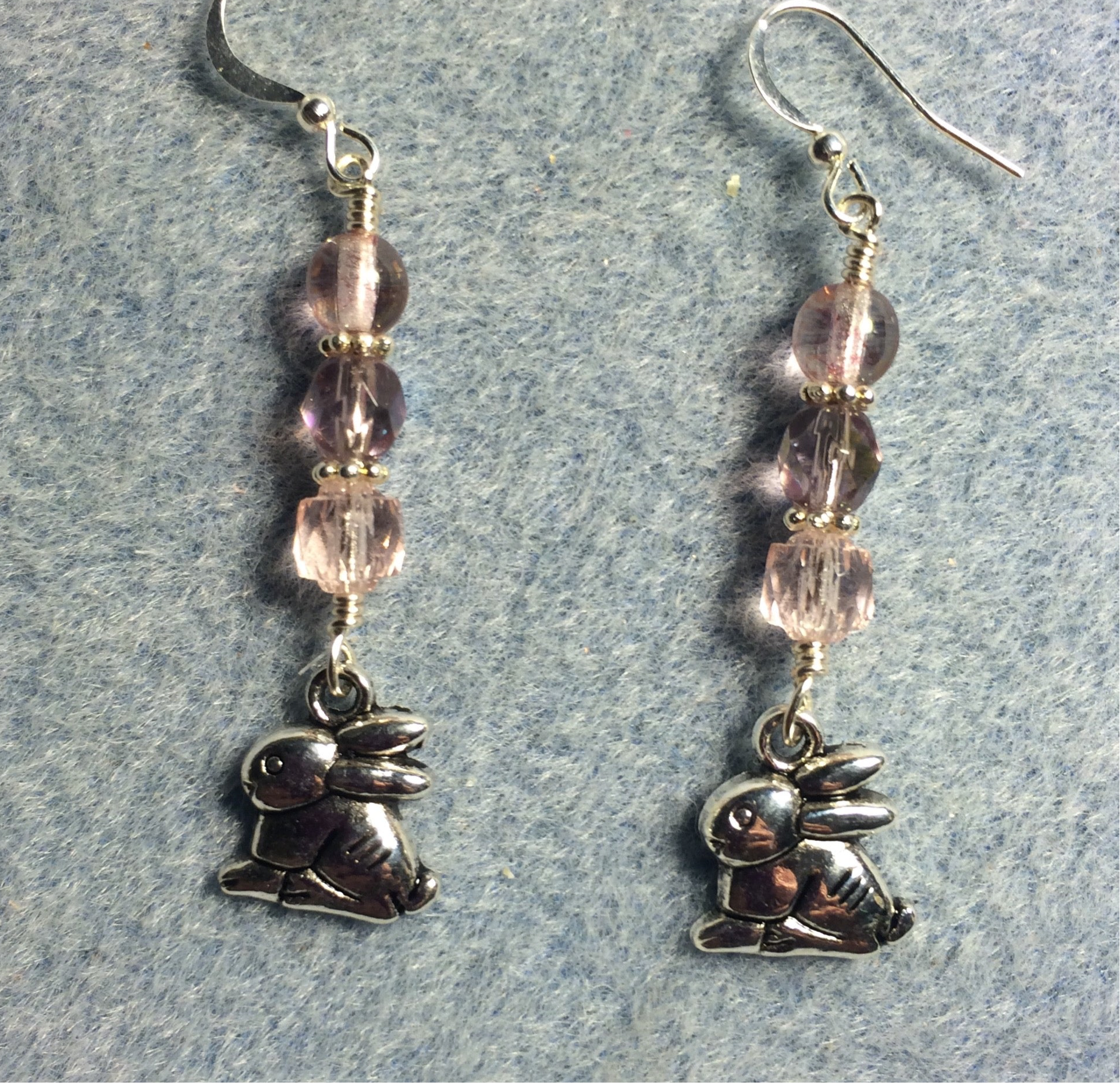 These adorable earrings are made with small silver rabbit charms and are adorned with pink Czech glass beads.