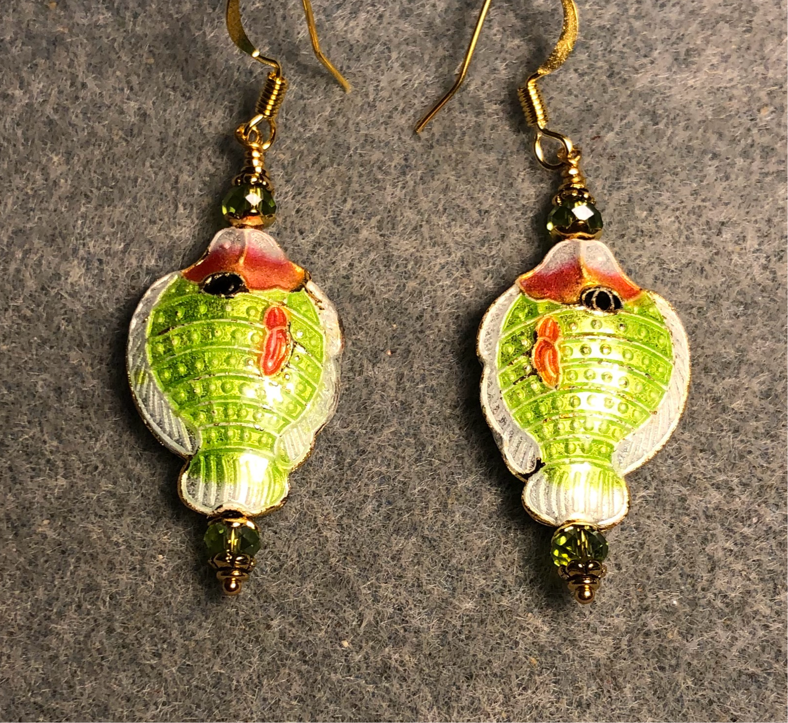 Olive green and peach cloisonné fish bead earrings adorned with olive green Chinese crystal beads.