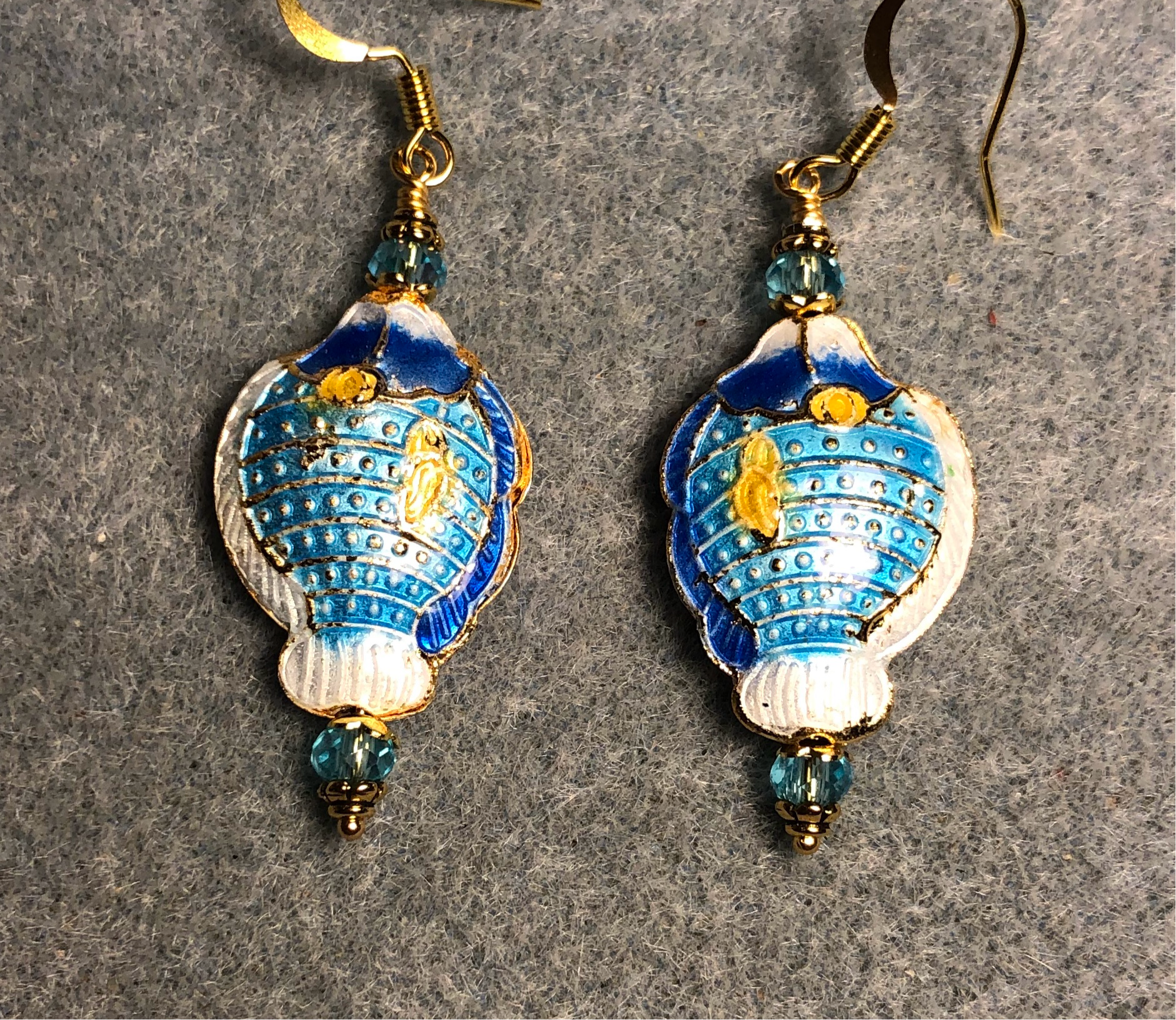 Turquoise and dark blue cloisonné fish bead earrings adorned with turquoise Chinese crystal beads.