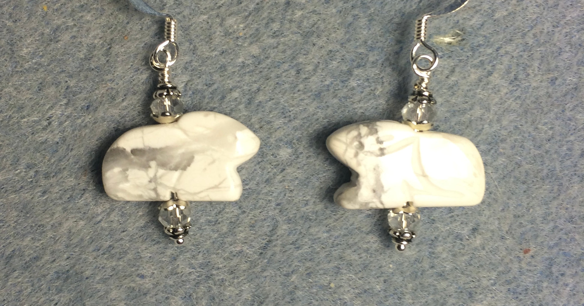 White howlite gemstone Zuni rabbit bead earrings adorned with clear Chinese crystal beads.