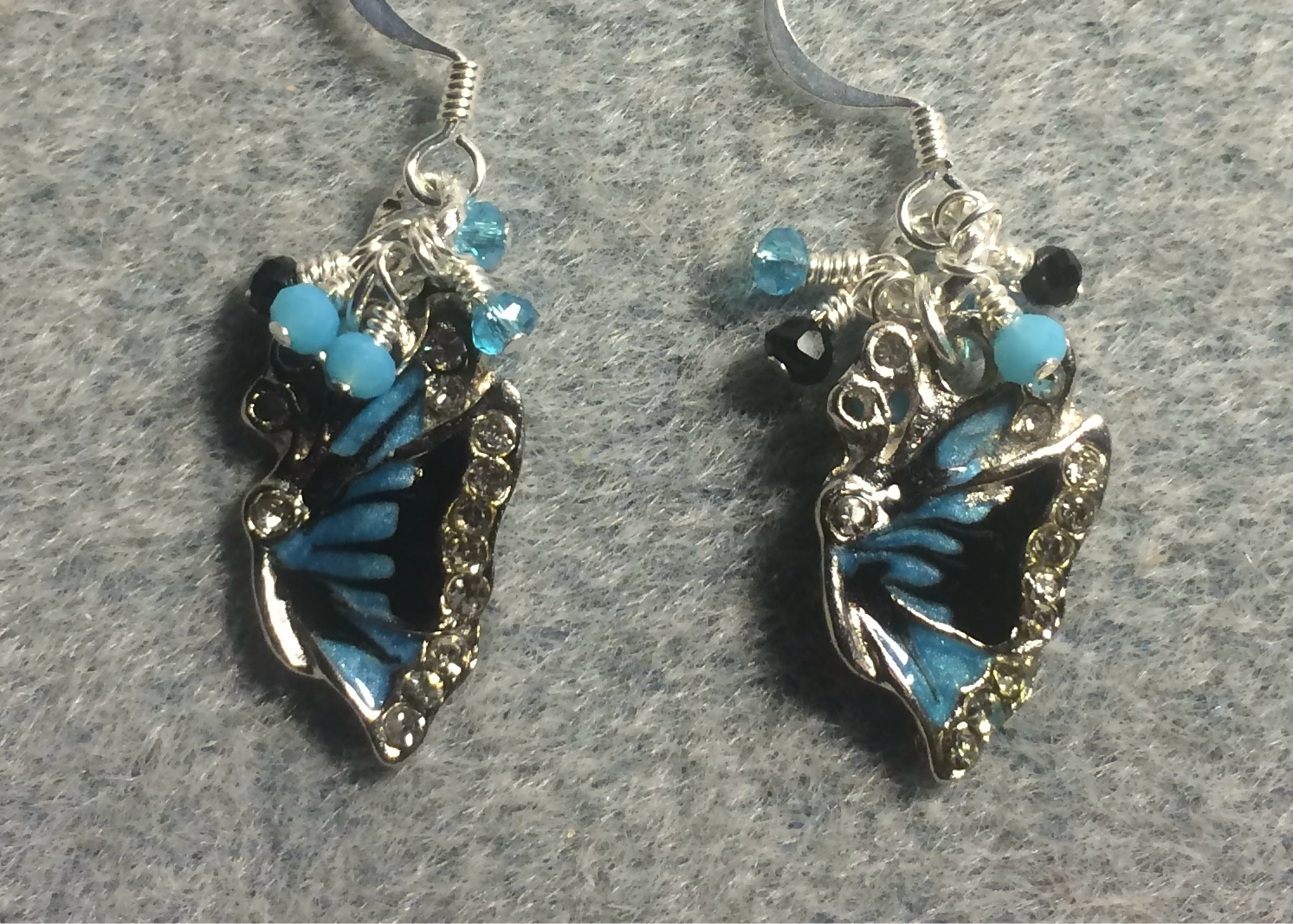 Turquoise and black enamel butterfly charm earrings adorned with tiny dangling turquoise and black Chinese crystal beads.