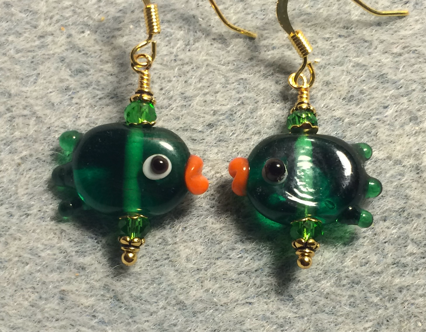 These adorable earrings are made with translucent emerald green lamp work fish beads and are adorned with emerald green Chinese crystal beads. These fish beads have darling orange lips.