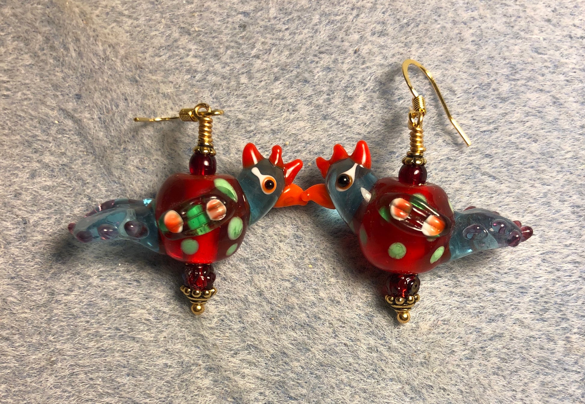 These adorable earrings are made with translucent dark red and blue polka dotted lamp work chicken beads and are adorned with dark red Czech glass beads. The dark red chickens have bright red beaks and combs, translucent blue heads and tails and are covered with green polka dots.