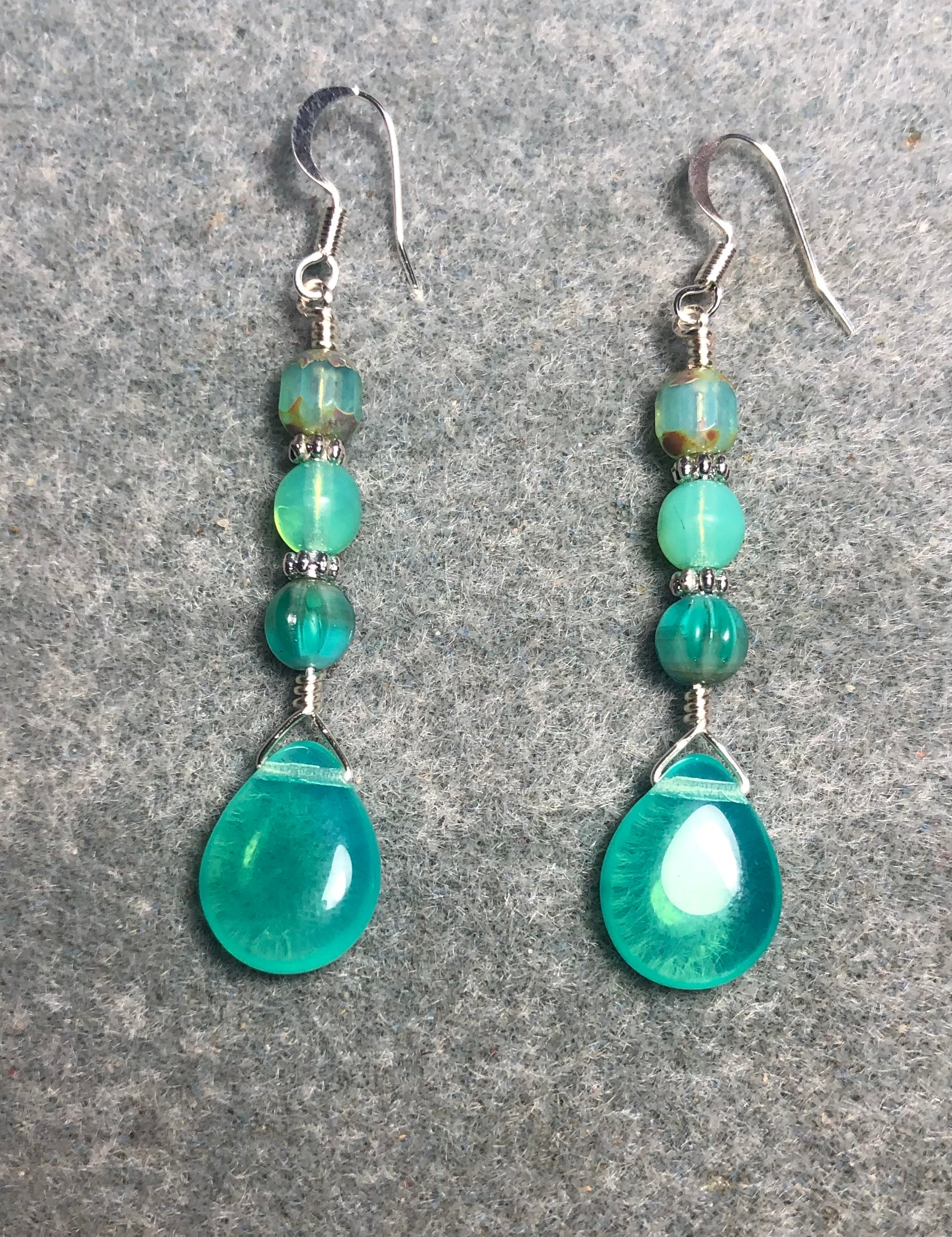These beautiful earrings are made with milky turquoise Czech glass pear drop beads and are adorned with milky turquoise Czech glass beads.