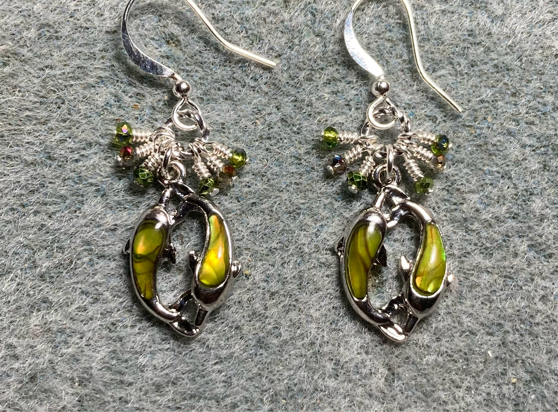 Small green abalone pair of dolphin charm earrings adorned with tiny dangling olive green Chinese crystal beads.