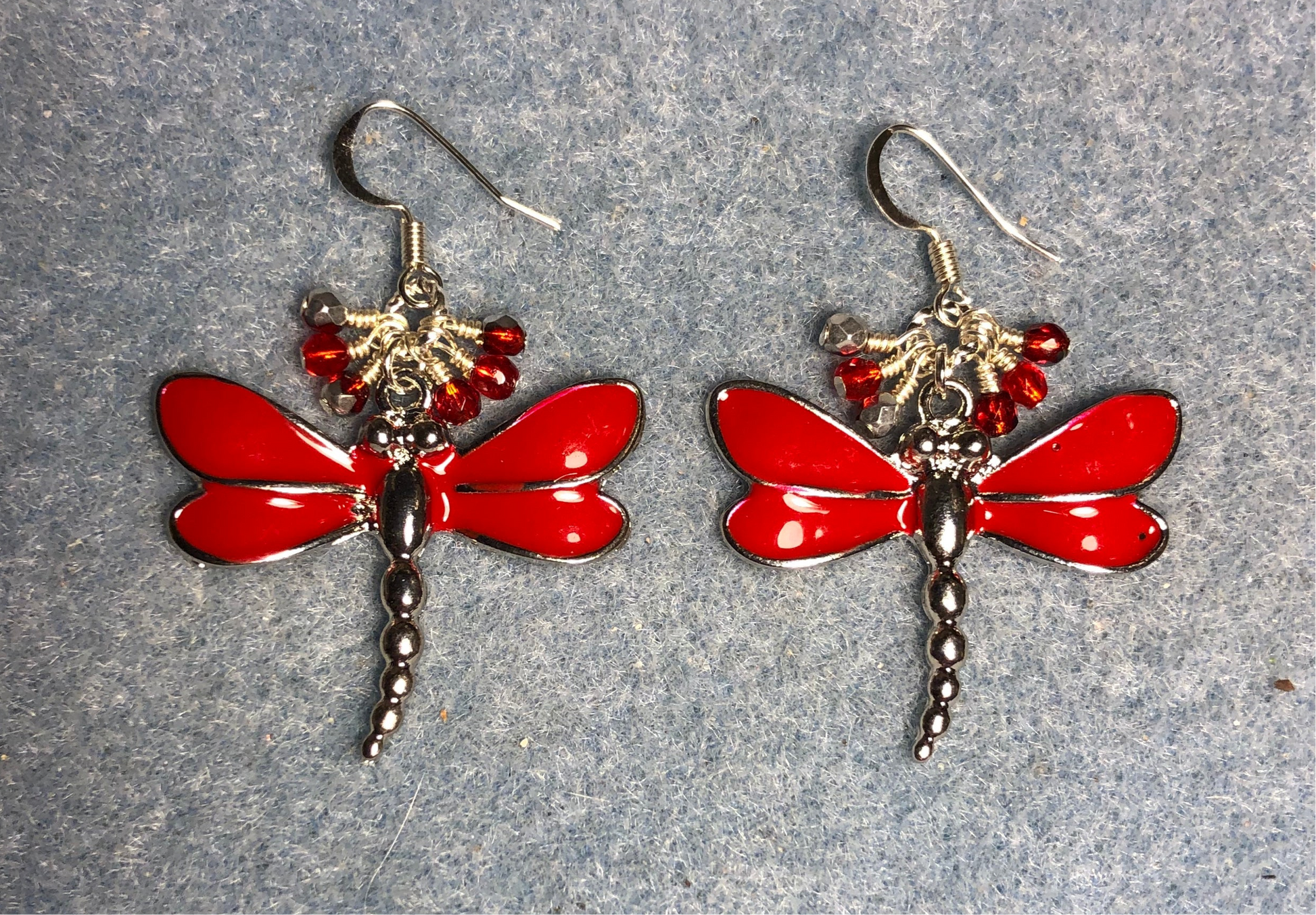 Large red and silver enamel dragonfly charm earrings adorned with tiny dangling red and silver Chinese crystal beads.