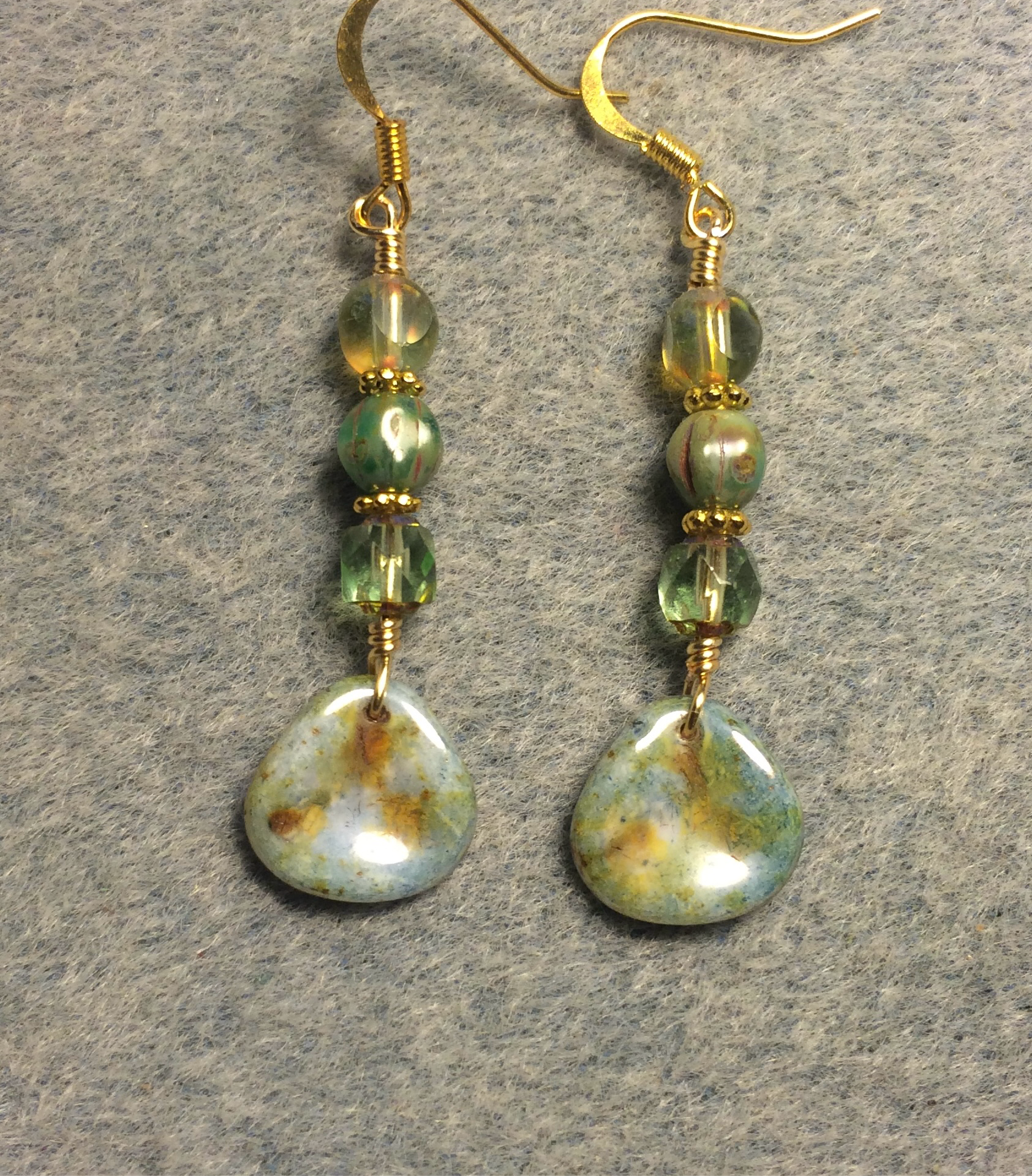 These beautiful earrings are made with light green Picasso Czech glass rose petal beads and are adorned with light green Czech glass beads.