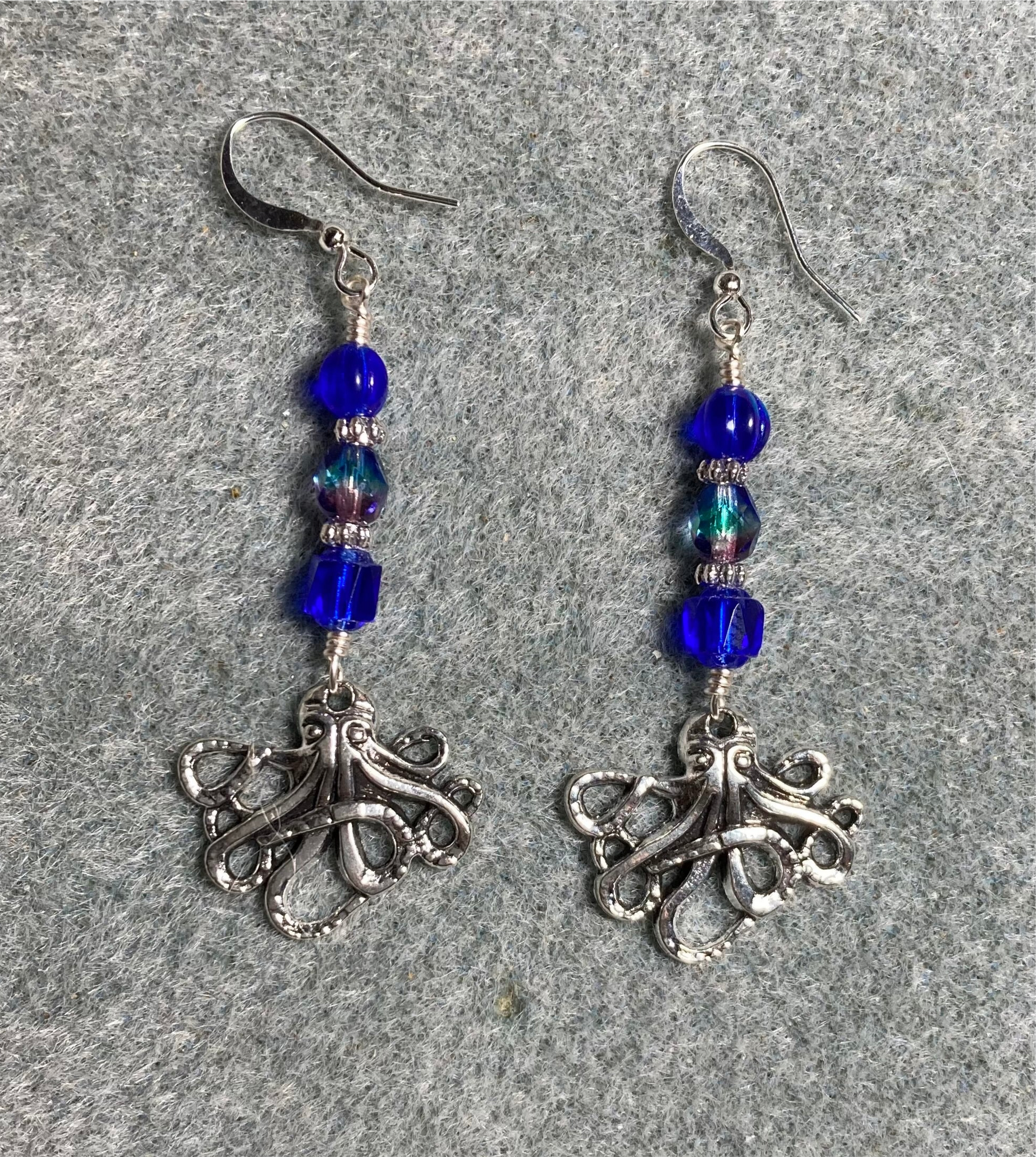 Silver octopus charm earrings adorned with dark blue Czech glass beads.