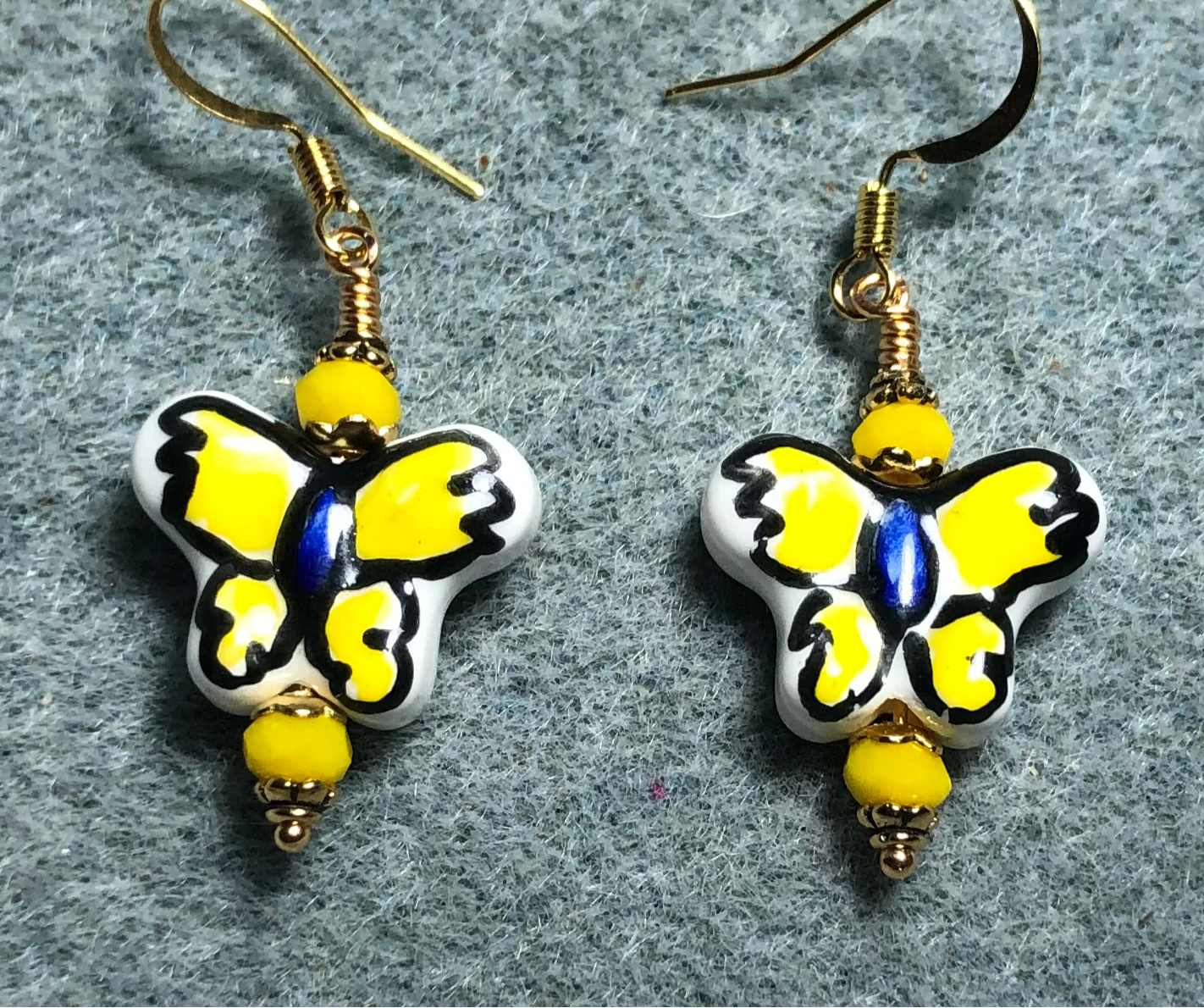 Yellow and purple ceramic butterfly bead earrings adorned with yellow Chinese crystal beads.