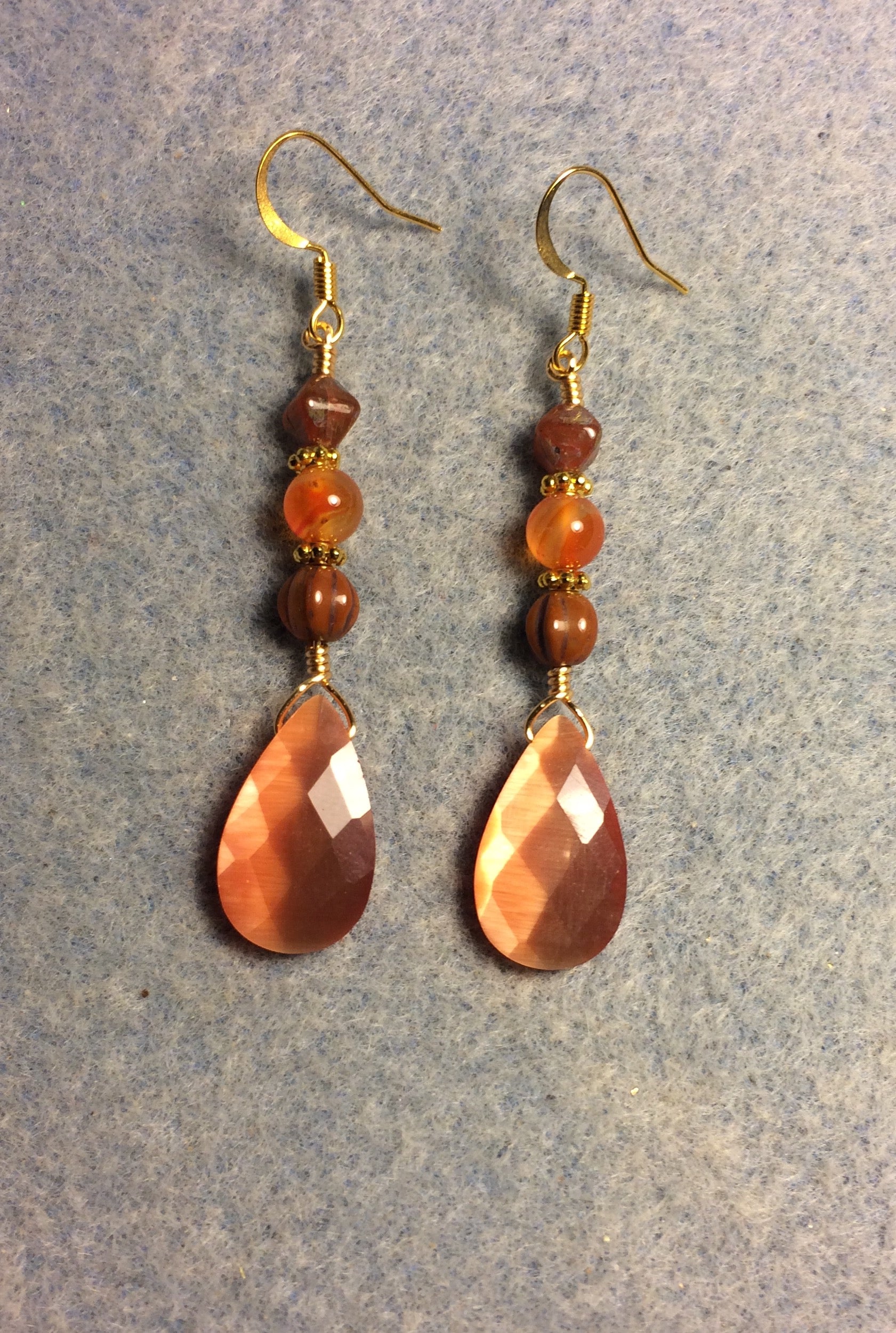 Orange fiber optic briolette bead earrings adorned with orange Czech glass beads.
