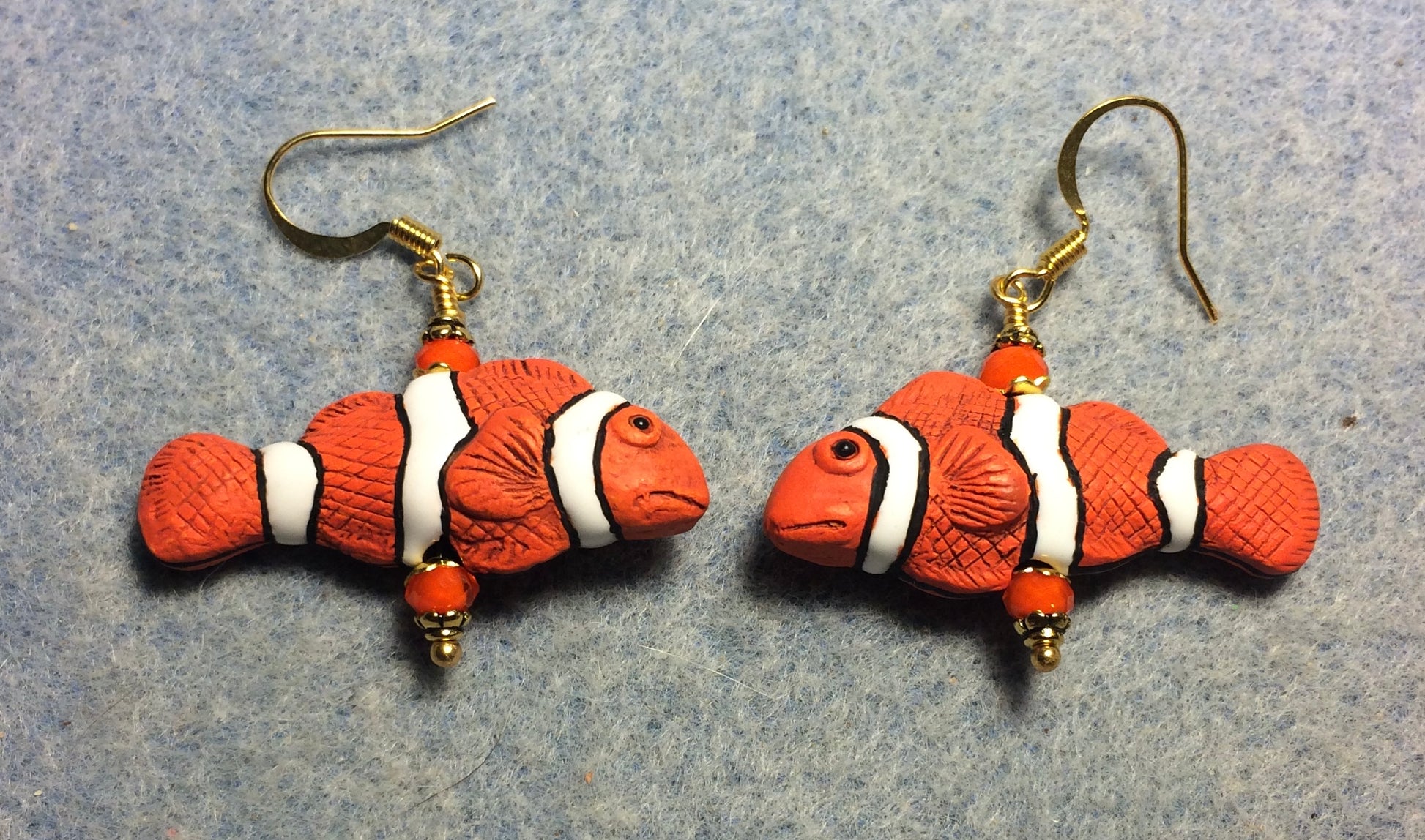 Orange, black, and white ceramic striped clownfish bead earrings adorned with orange Chinese crystal beads.