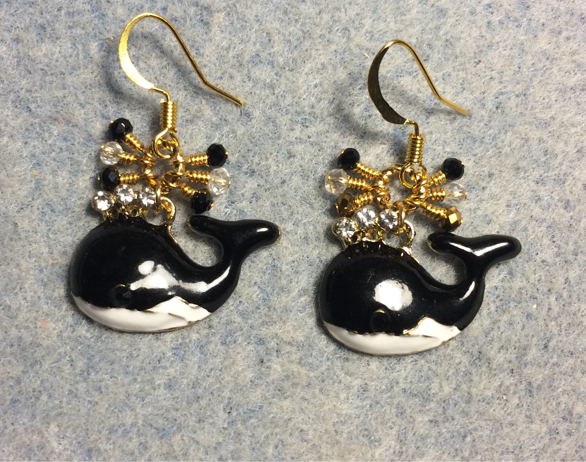 These adorable earrings are made with black and white enamel and rhinestone whale charms and are adorned with tiny dangling black and clear Chinese crystal beads. The black and white whales look like they have water (in the form of three clear rhinestones) coming out of their spouts.