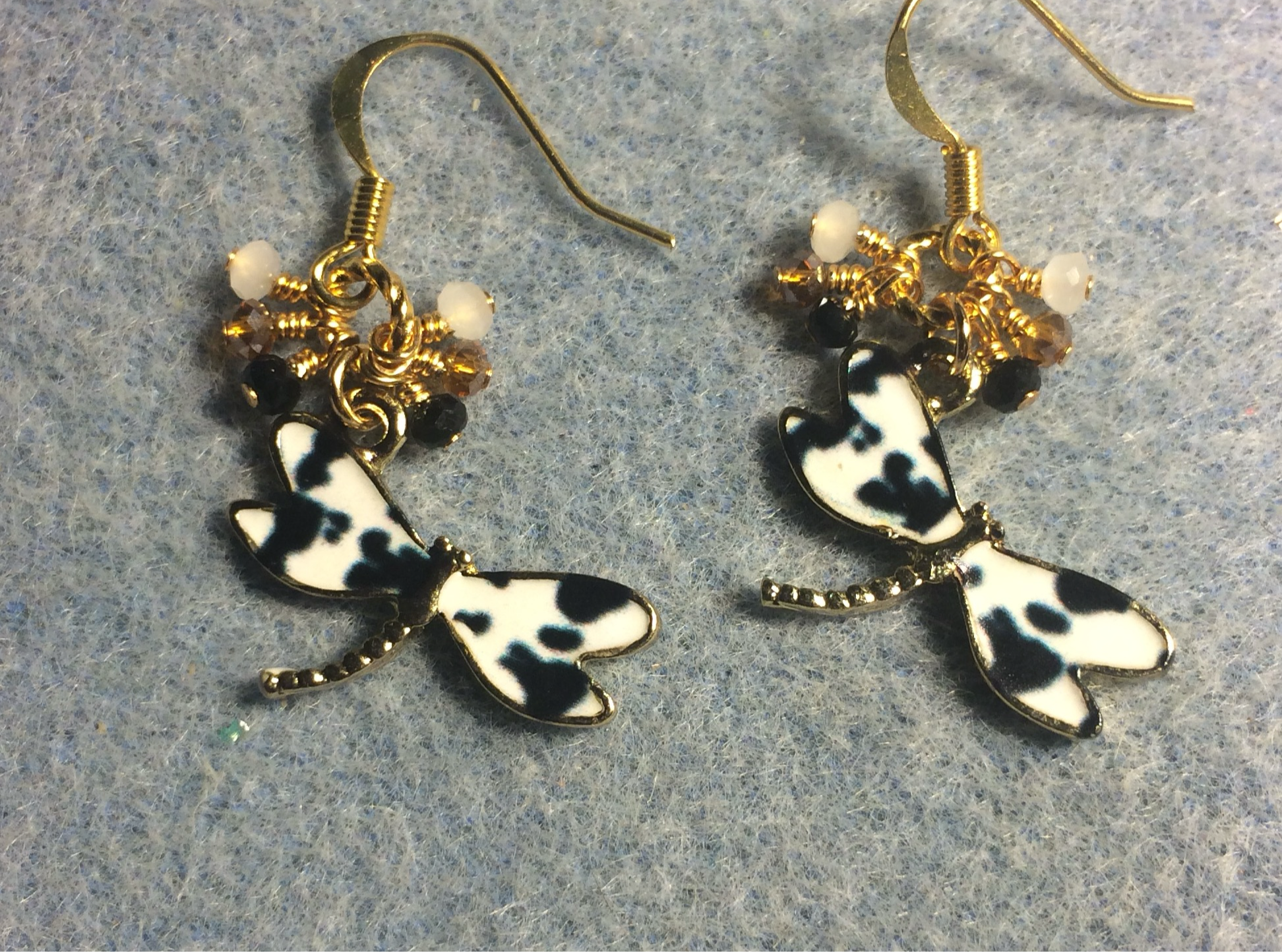 These adorable earrings are made with black and white enamel dragonfly charms and are adorned with tiny dangling black, white, and amber Chinese crystal beads.