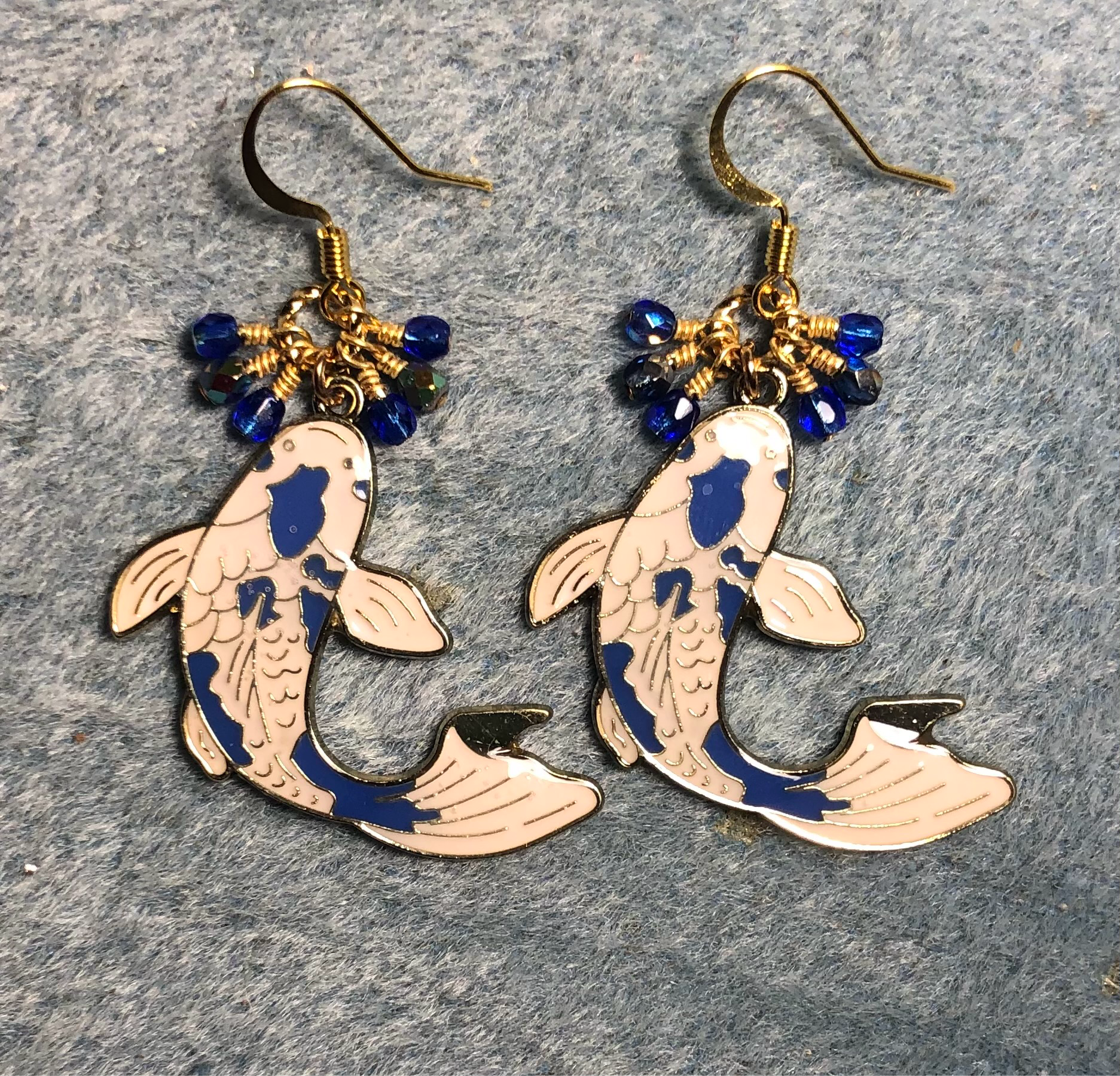 These adorable earrings are made with large blue and white enamel koi charms and are adorned with small dangling dark blue Czech glass beads.
