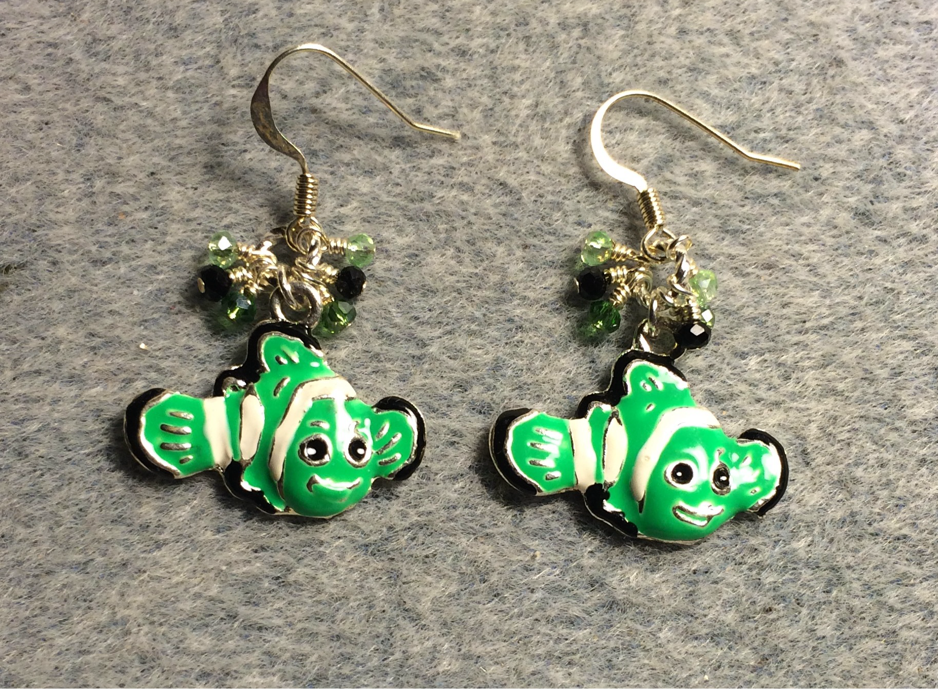 These adorable earrings are made with green, black, and white enamel striped fish charms and are adorned with tiny dangling green and black Chinese crystal beads.
