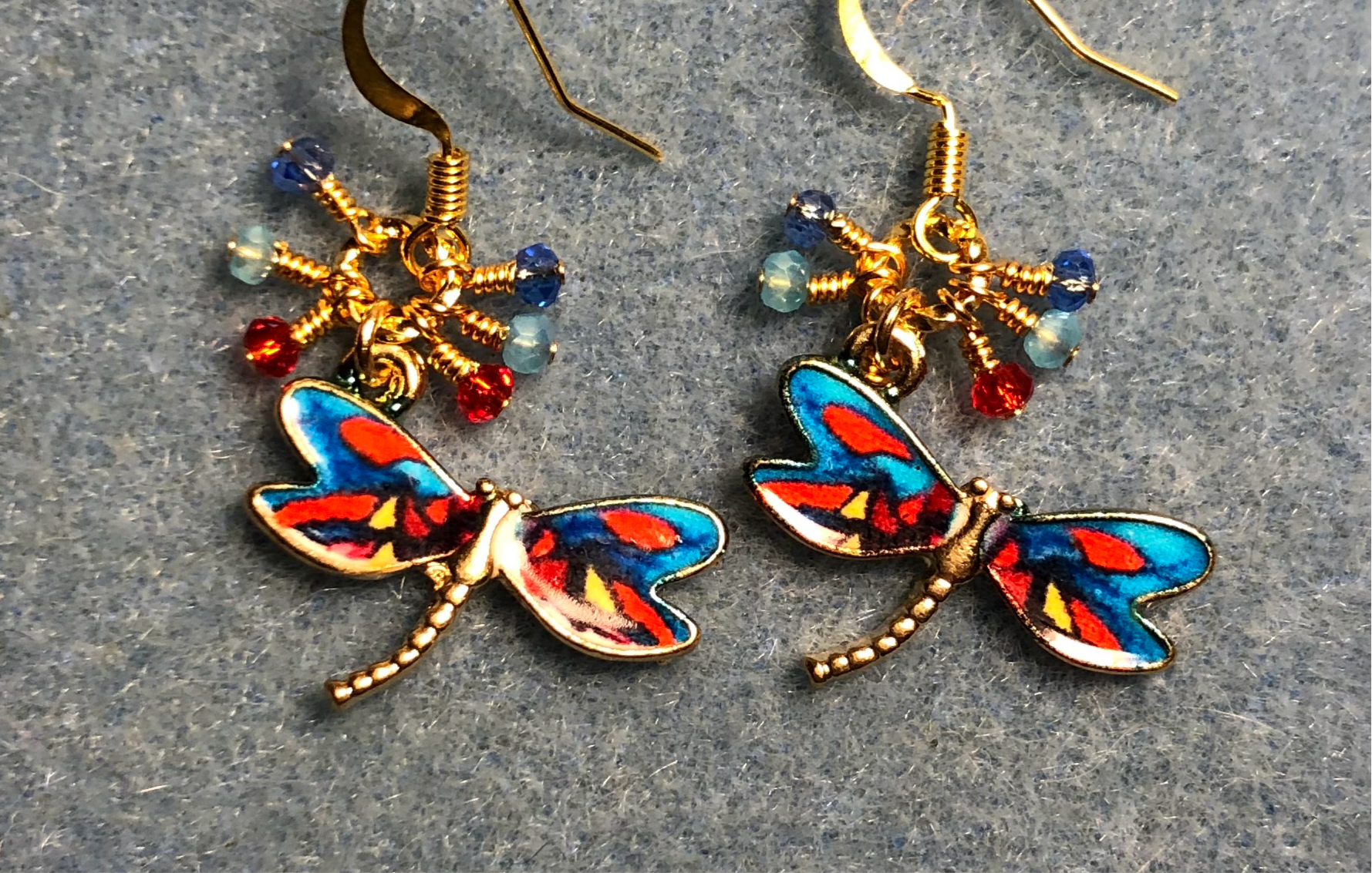 Turquoise, red, and blue enamel dragonfly charm earrings adorned with tiny dangling turquoise, red, and blue Chinese crystal beads.