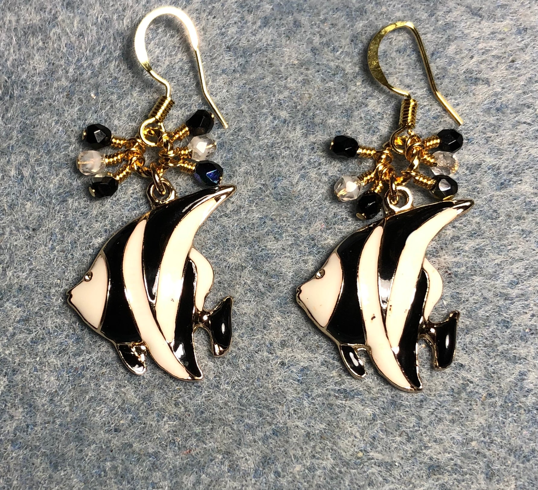 These adorable earrings are made with black and white enamel striped angelfish charms and are adorned with tiny dangling black and white Czech glass beads.