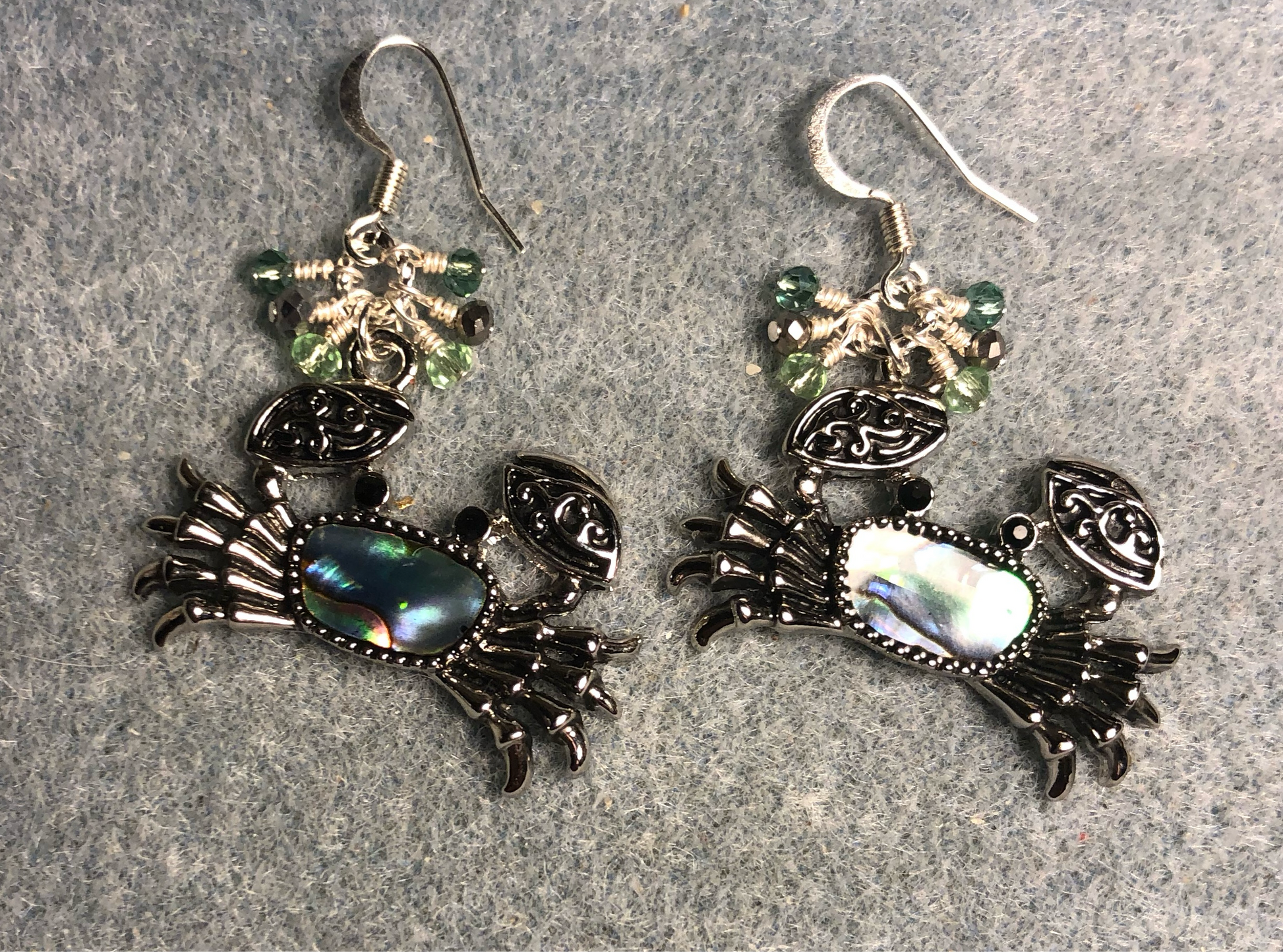 Silver and abalone crab charm earrings adorned with tiny dangling silver and green Chinese crystal beads.