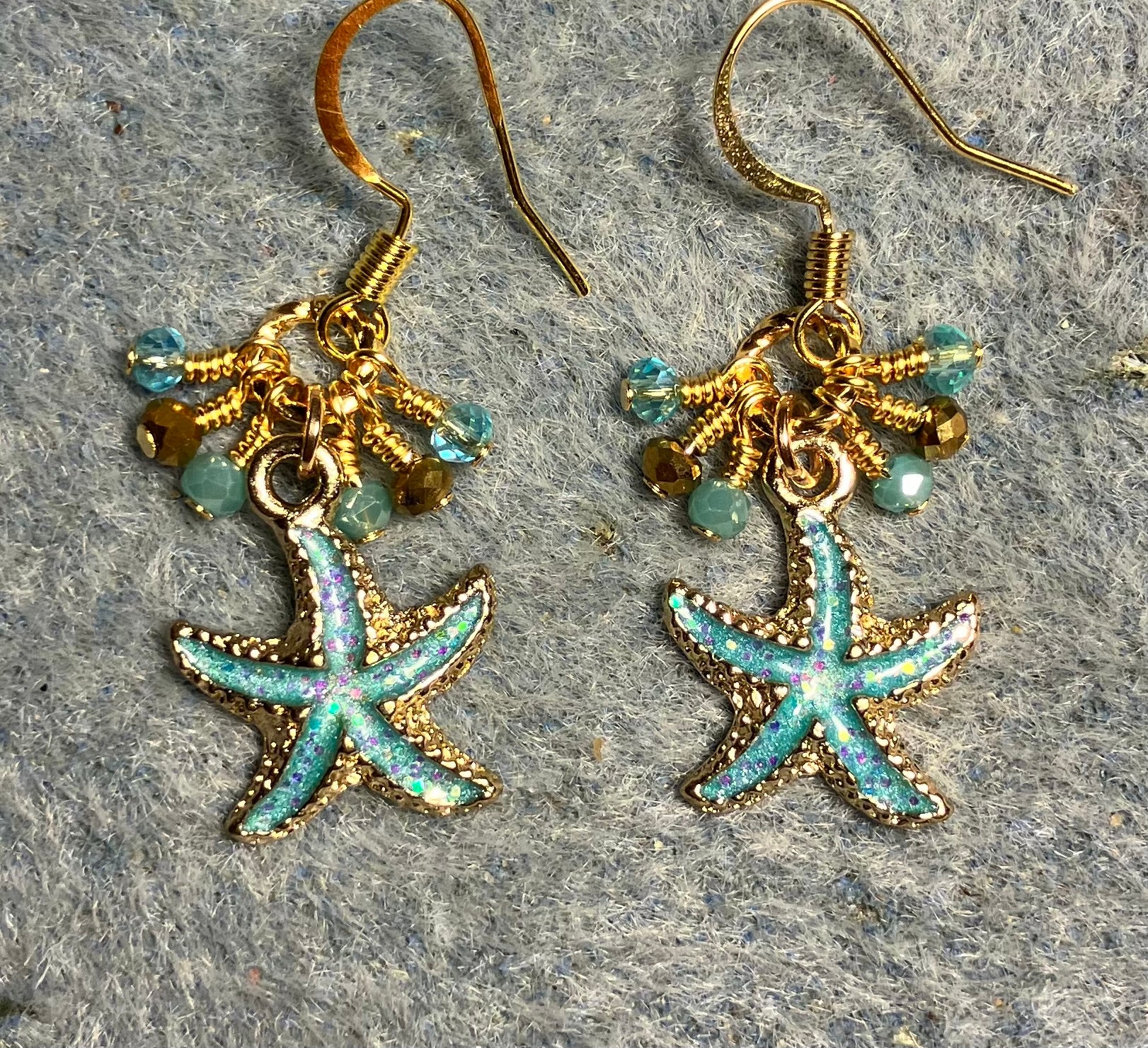 Aqua and gold enamel starfish charm earrings adorned with tiny dangling aqua and gold Chinese crystal beads.