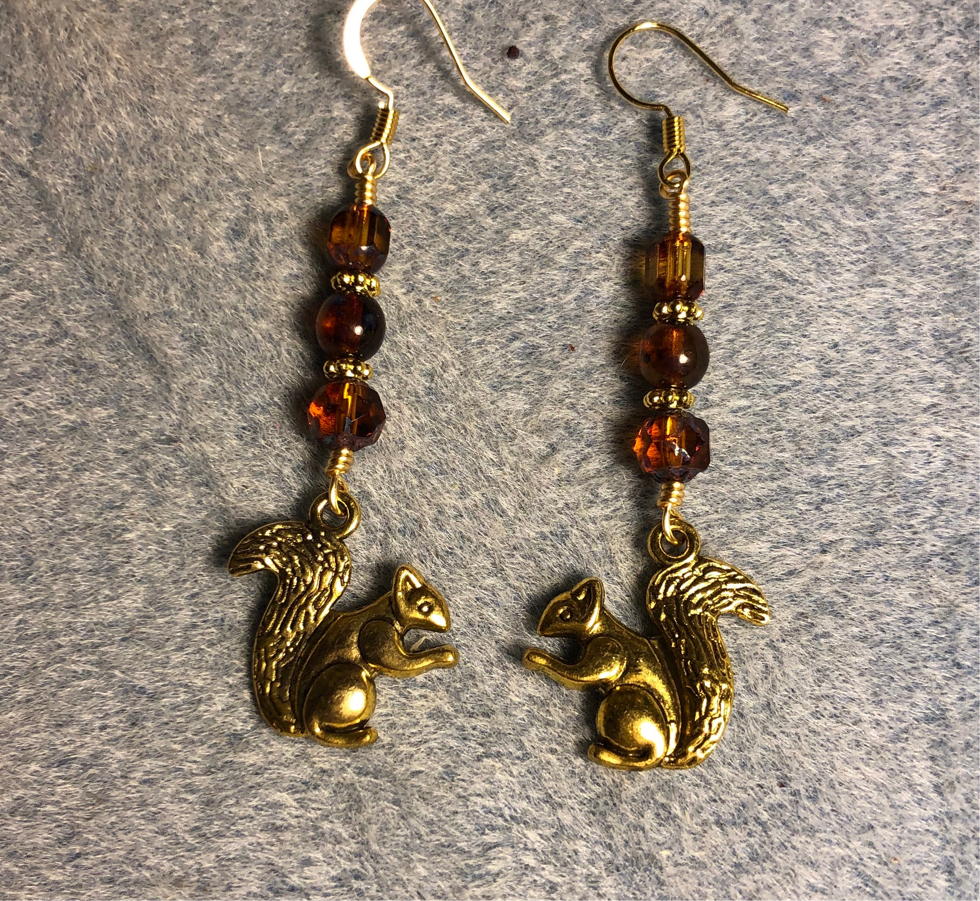 These beautiful earrings are made with gold squirrel charms and are adorned with brown Czech glass beads.