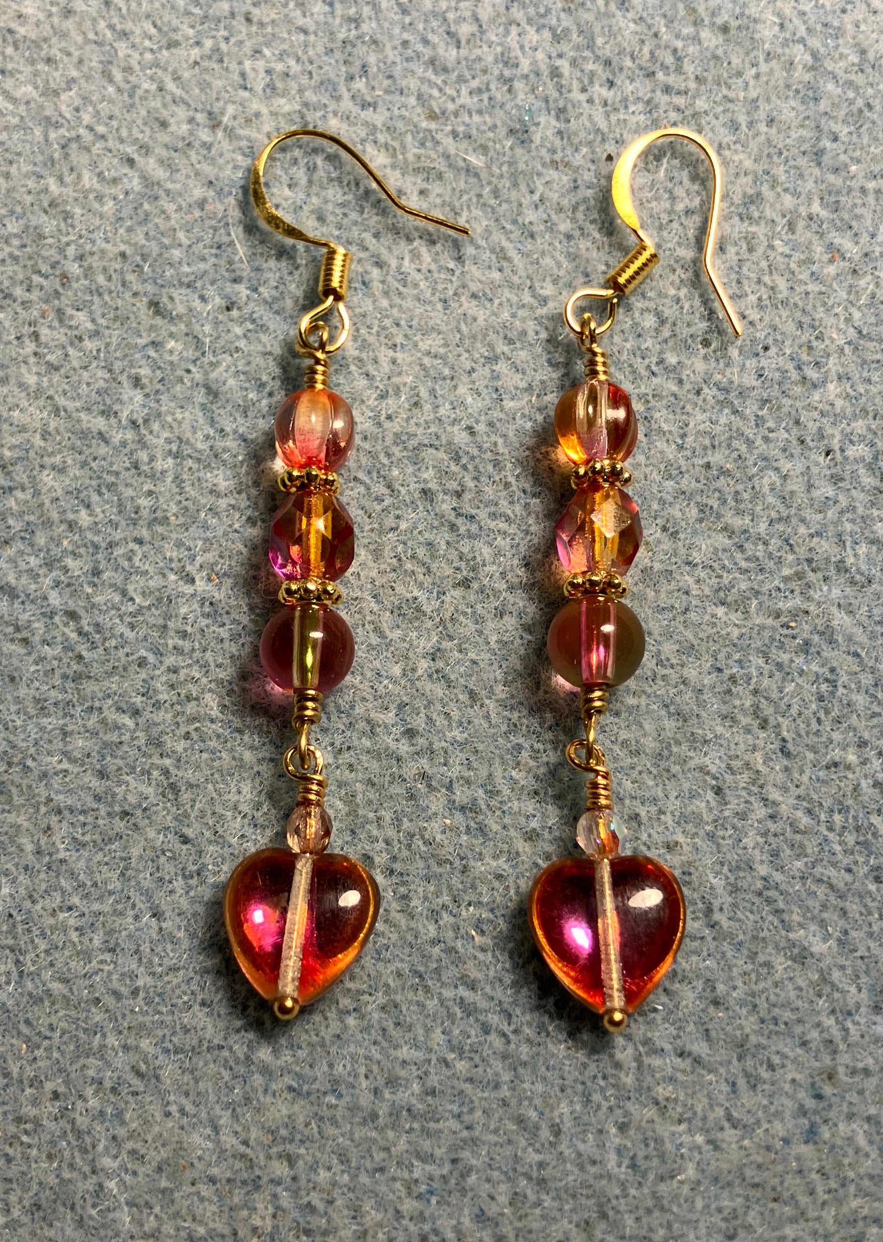 These beautiful earrings are made with small pinkish orange Czech glass heart beads and are adorned with pinkish orange Czech glass beads.