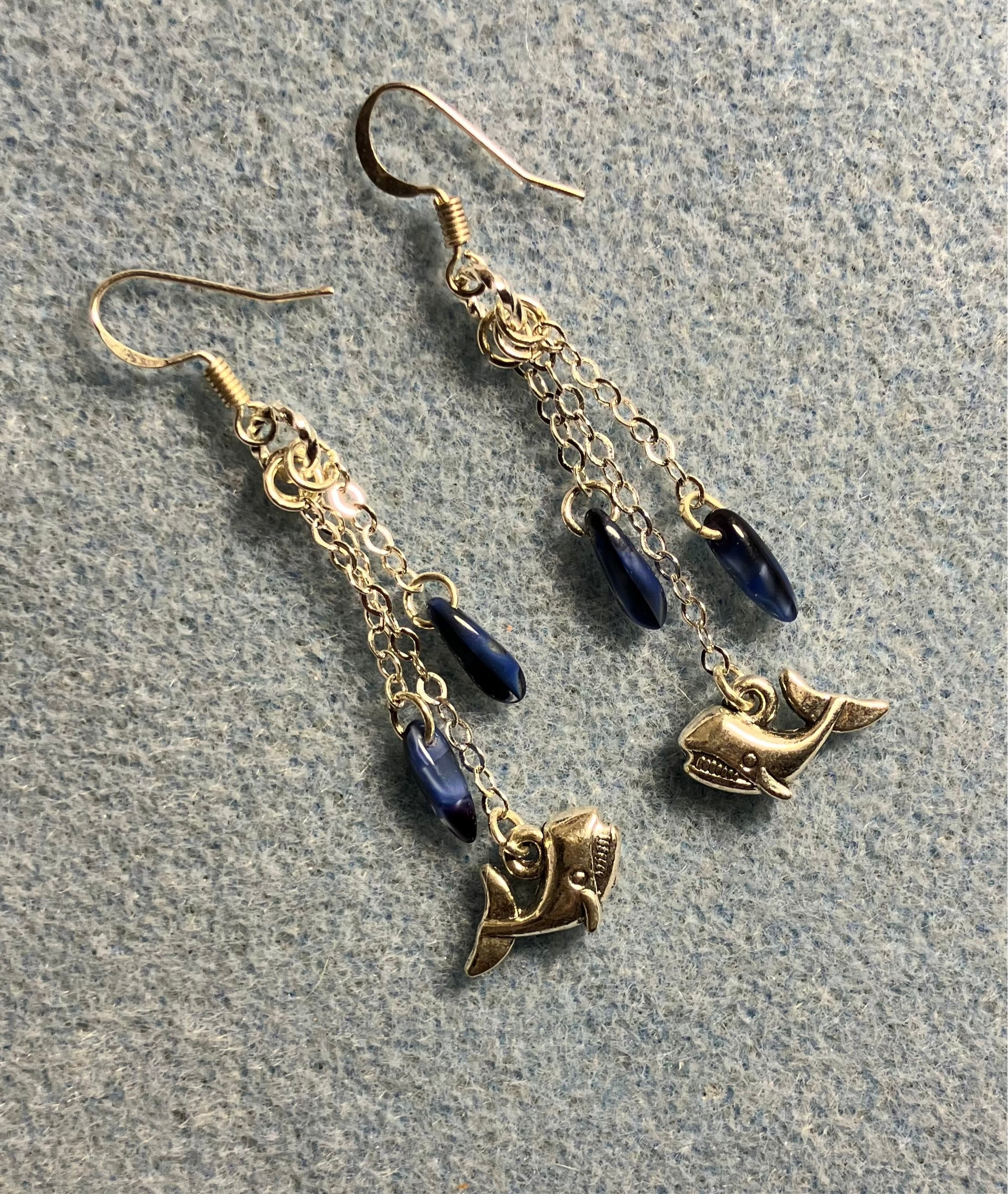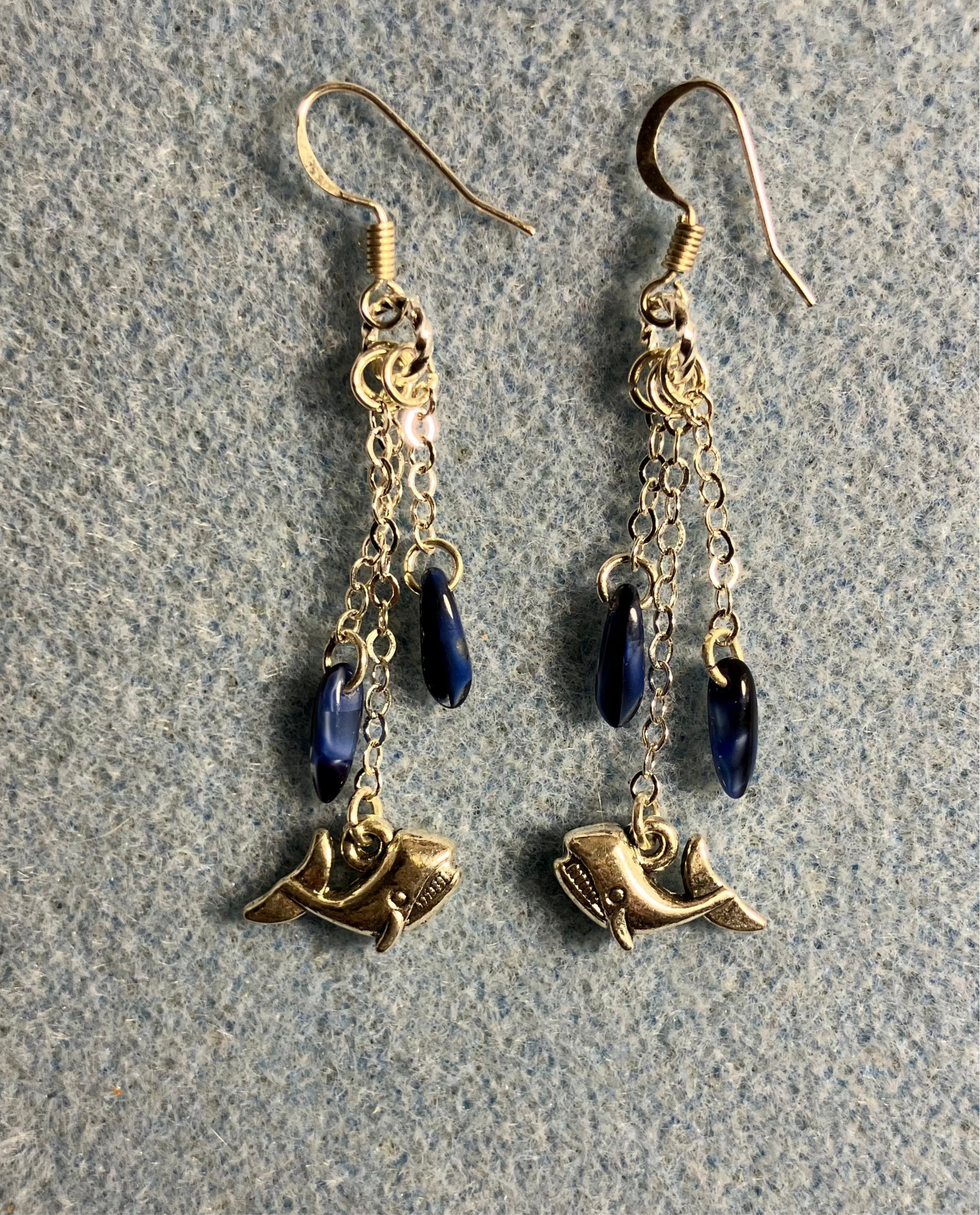 These adorable earrings are made with small silver whale charms and are attached to silver chain and adorned with small dark blue Czech glass dagger beads.